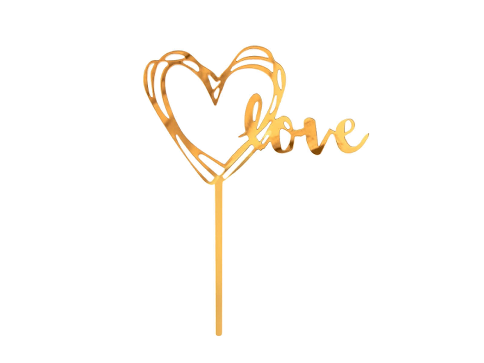 • Szív alakú topper a Love szóval arany színben, az ideális esküvői torta dekoráció.