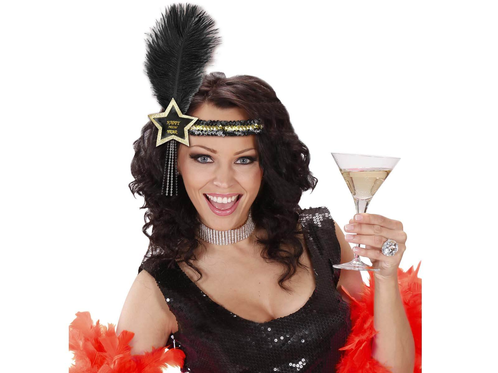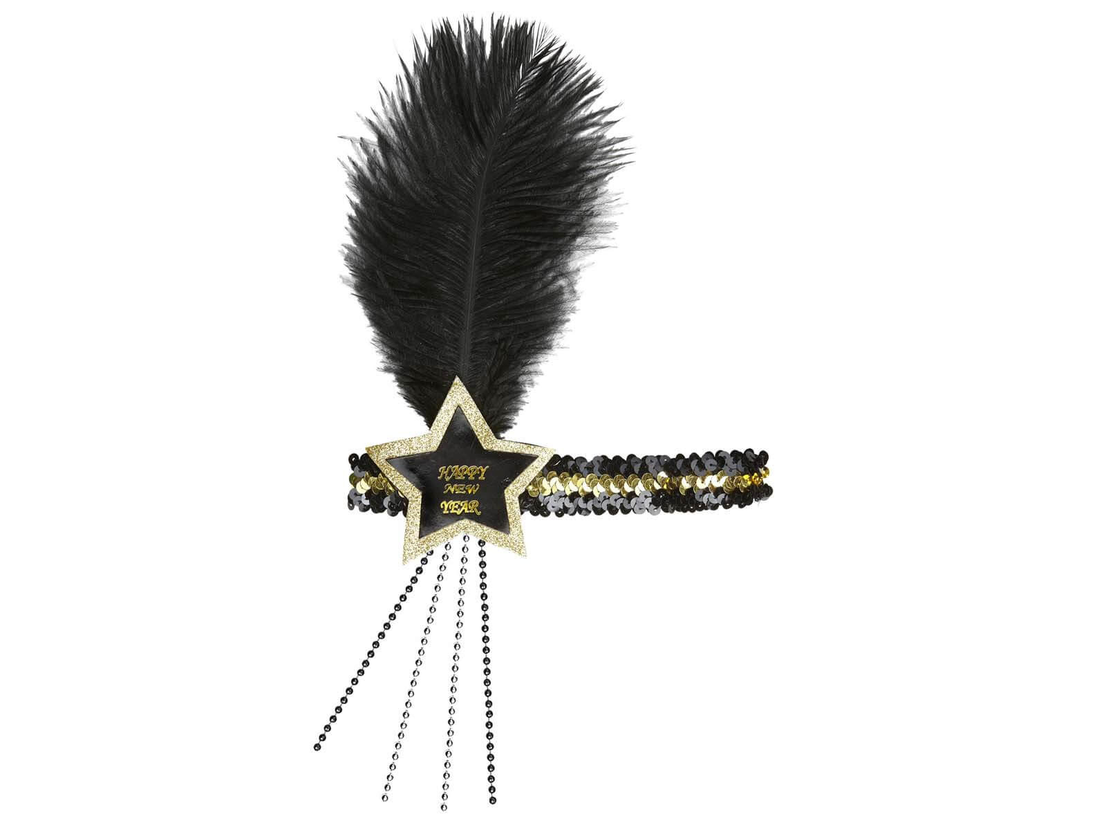 • Fejpánt tollal, csillaggal, Boldog új évet felirattal és fekete és arany flitterekkel.