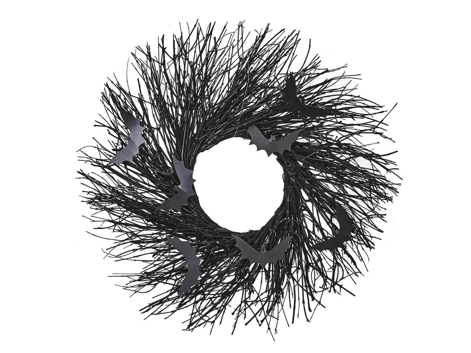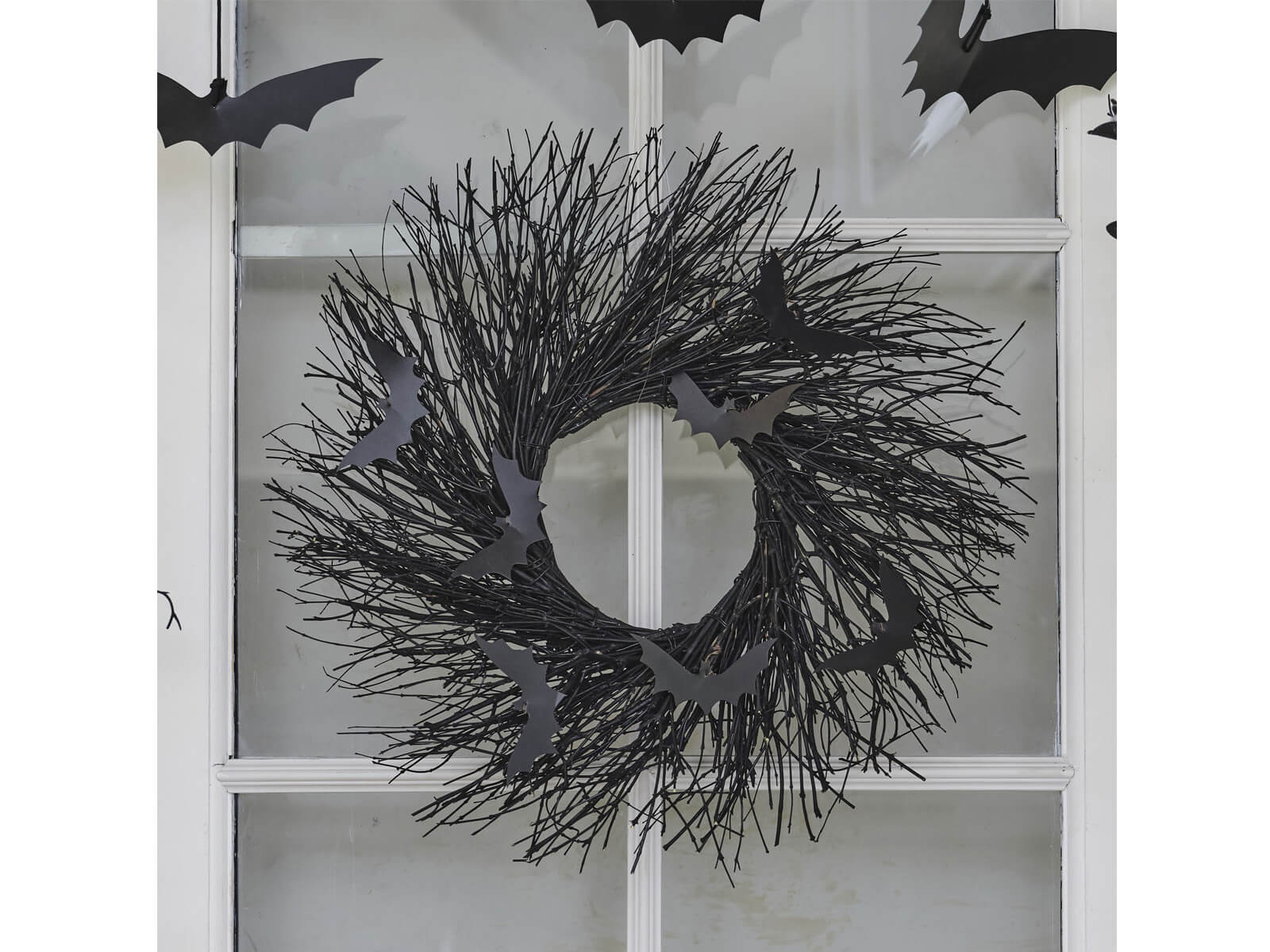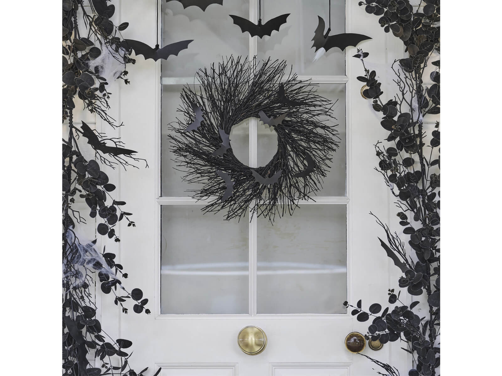 Fedezze fel a tökéletes dekorációs elemet Halloweenre! A Halloween koszorú gallyakból készült, papírdenevérekkel díszített, tökéletes választás erre a különleges estére. A koszorú átmérője 45 cm, így látható és vonzó kiegészítője bármilyen térnek, mind beltéren, mind kültéren.
