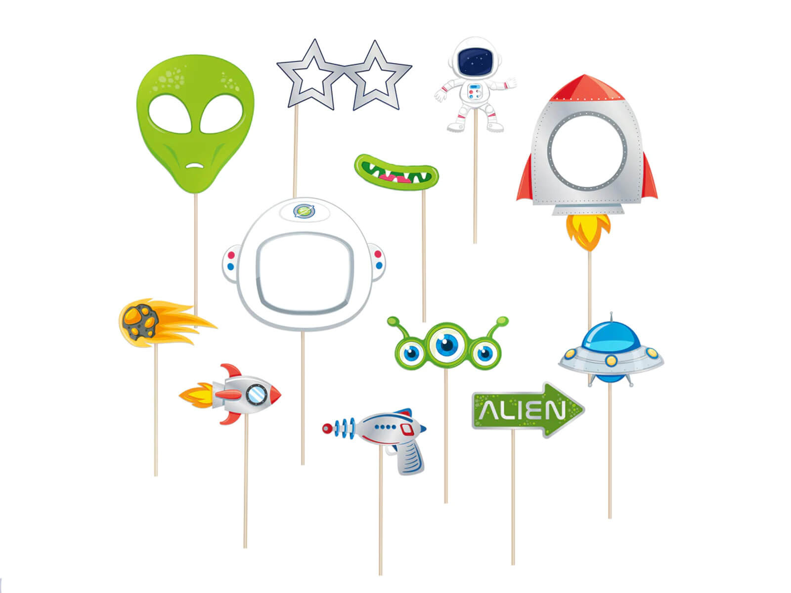 A készlet tartalmaz: idegen fej, űrhajós fej, nagy és kis rakéta, űrhajó, csillag alakú szemüveg, idegen szemek, űrhajós, lézerfegyver, idegen száj, meteorit.