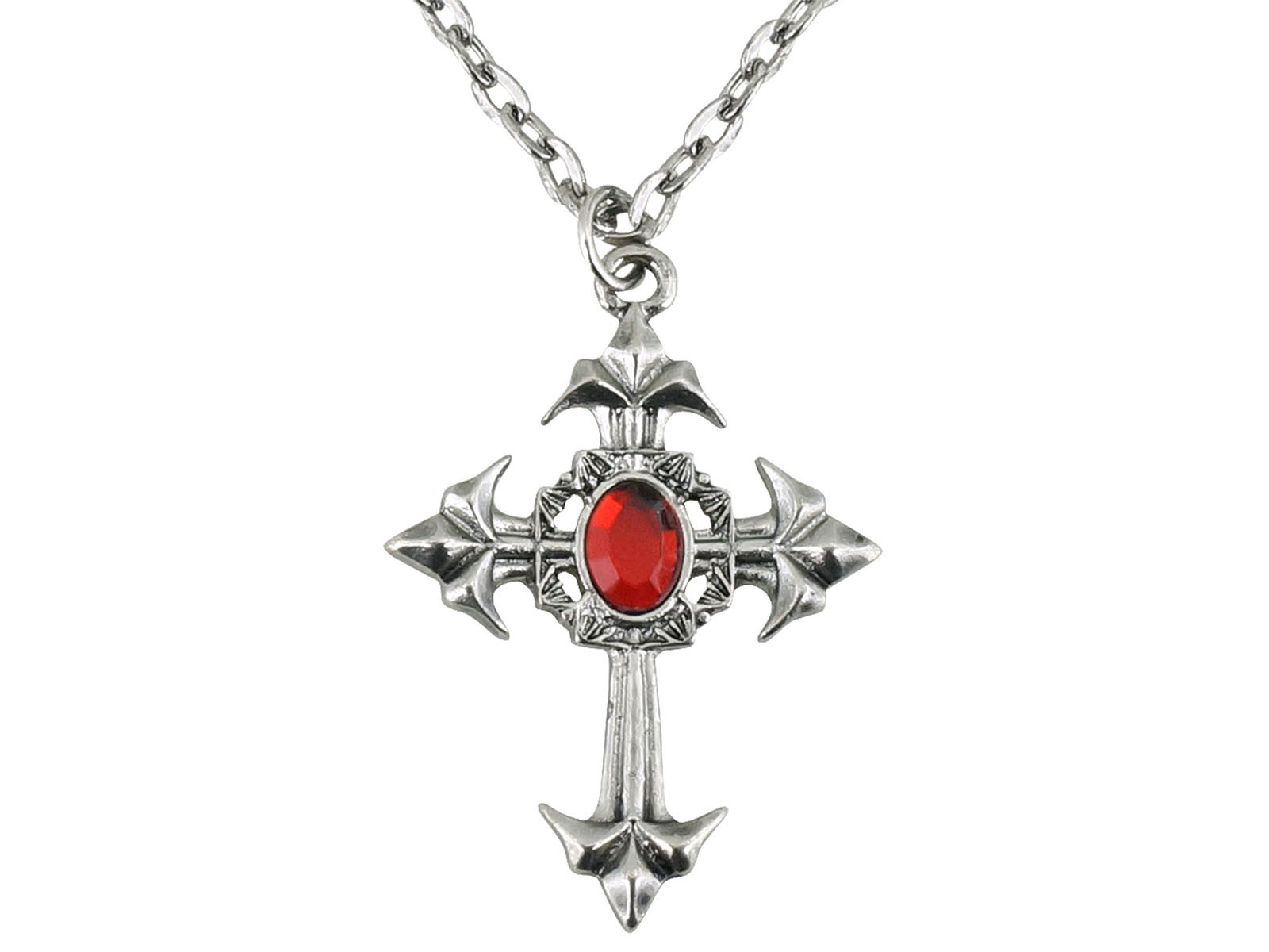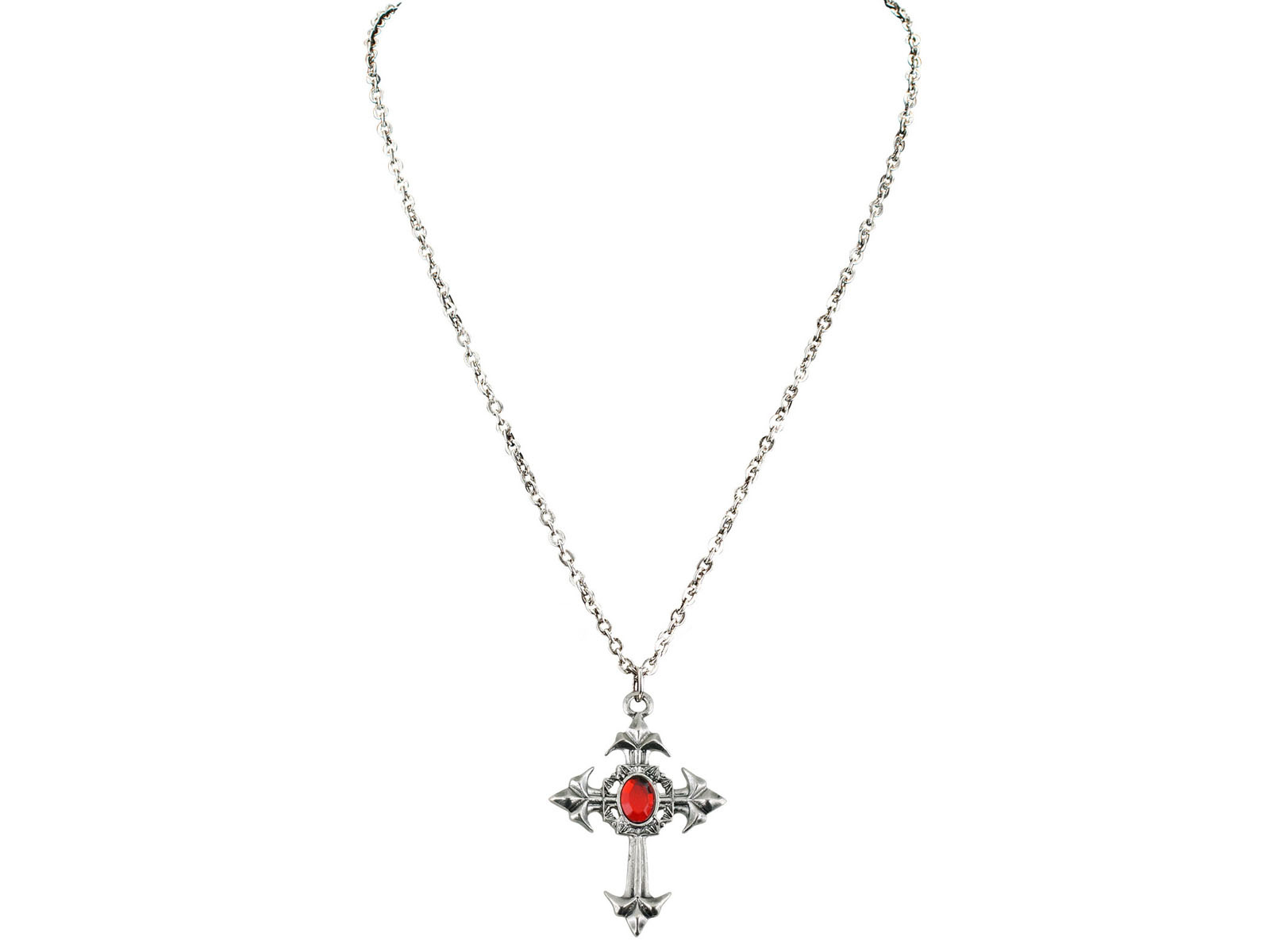 Gótikus kereszt nyaklánc piros kővel - 1 db.