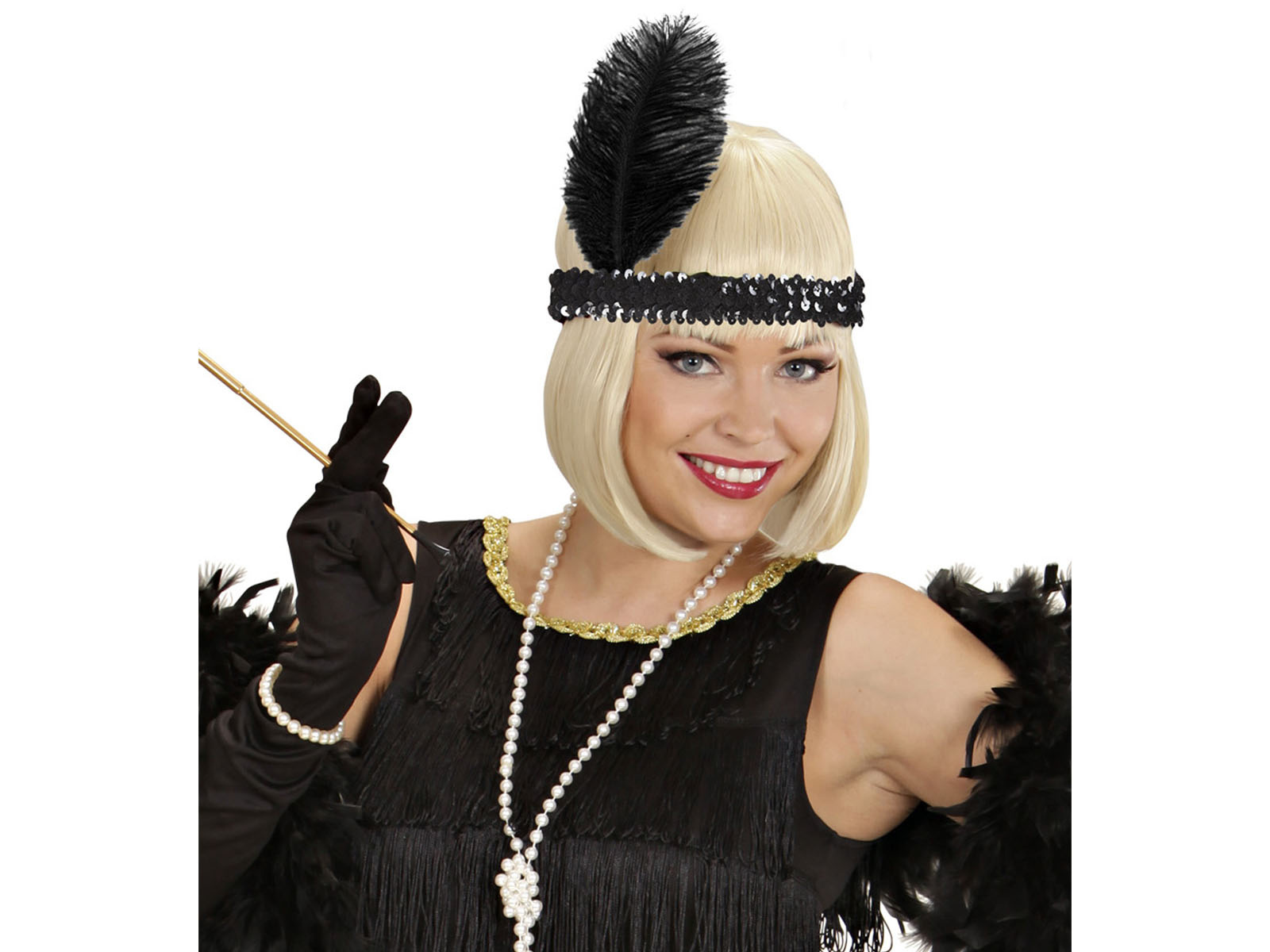 Merüljön el az elegancia és a csillogás világába az egyedülálló Retro fejpántunkkal. Fekete fejpánt díszített fekete tollal és fényes fekete flitterek a "Nagy Gatsby" korszakának fényűző báljaira és pezsgős partijaira repíti vissza Önt. Tökéletes választás 1920-as évekbeli tematikus partikhoz, szilveszterhez vagy karneváli őrülethez.