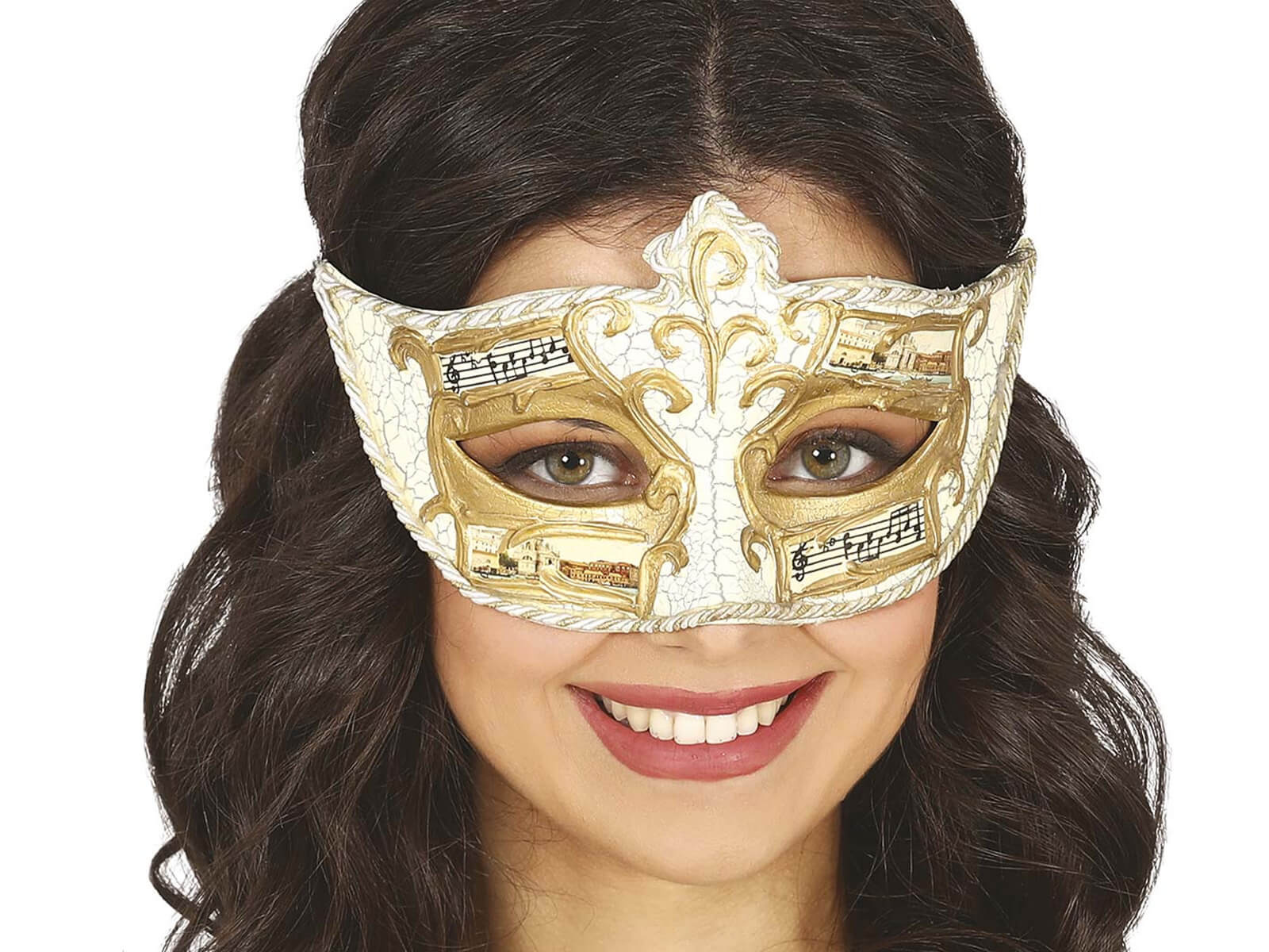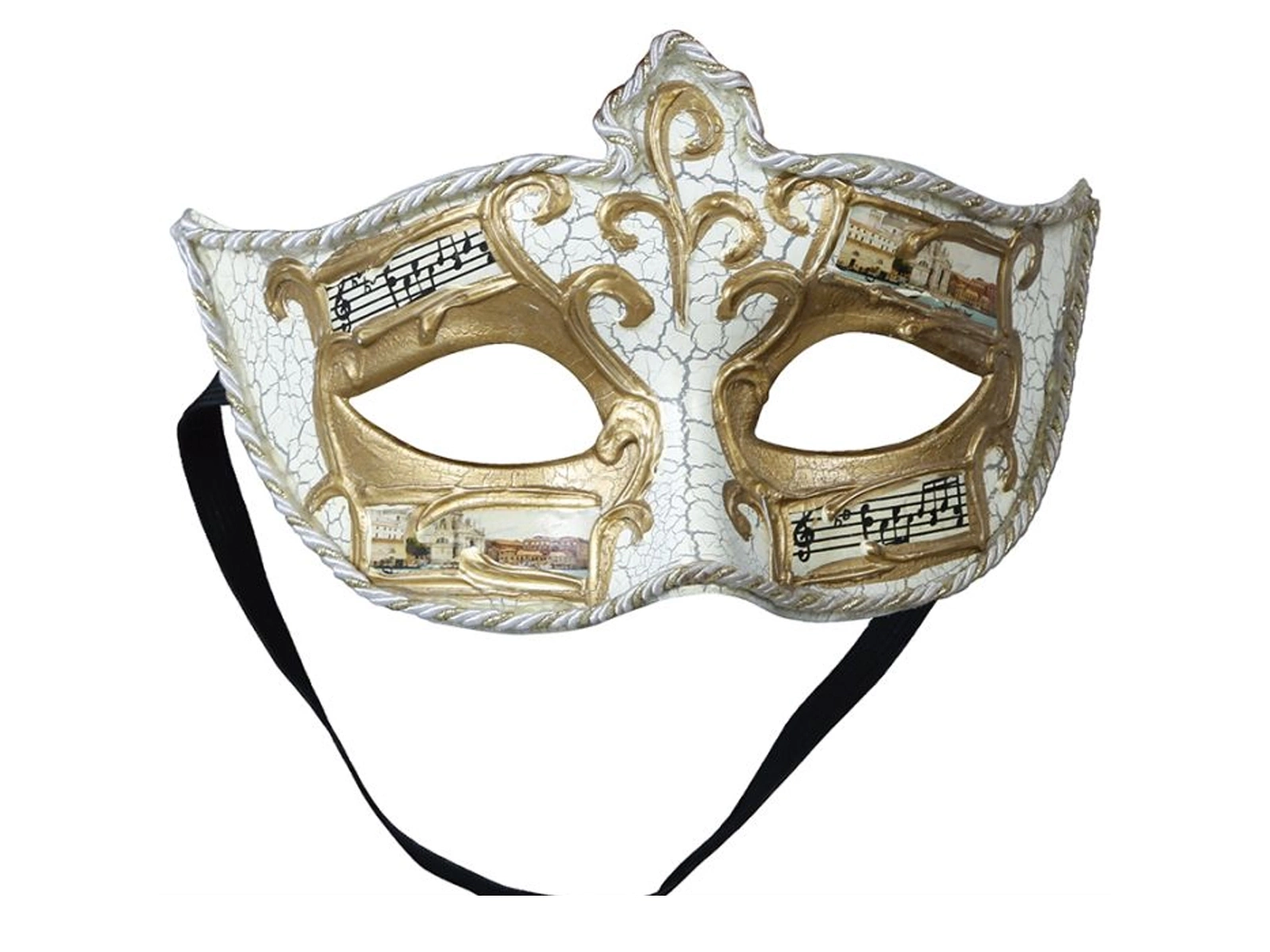 Fedezze fel a hagyományos velencei karneválok varázsát exkluzív fehér és aranyszínű, stílusos zenei motívumokkal díszített karneváli maszkunkkal. Ideális mindenféle ünnepséghez, a Szilveszter a után farsang és különleges alkalmakra, mint például egy leánybúcsú.