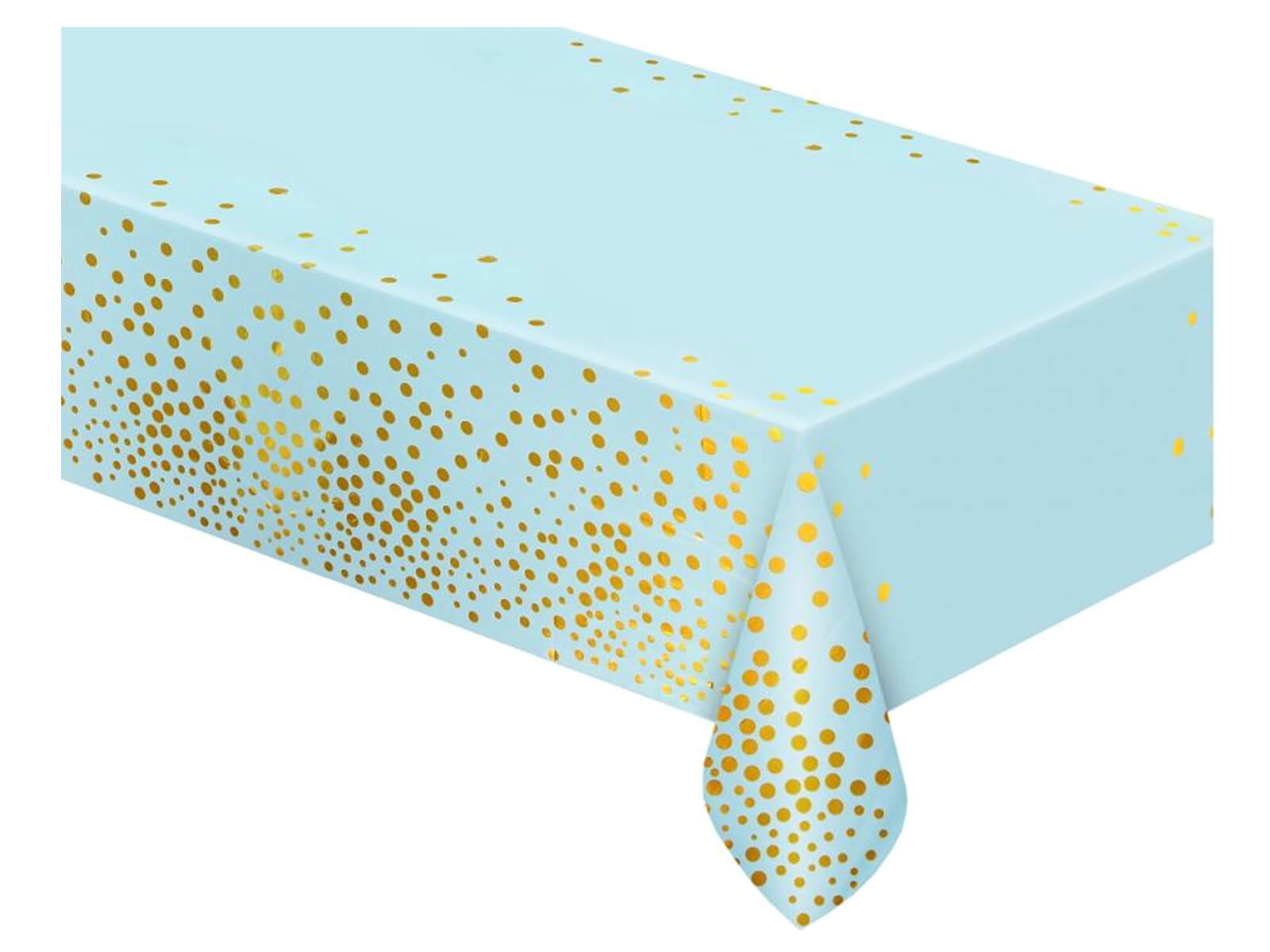 Világoskék születésnapi terítő arany pöttyökkel - 137 x 183 cm - 1 db.