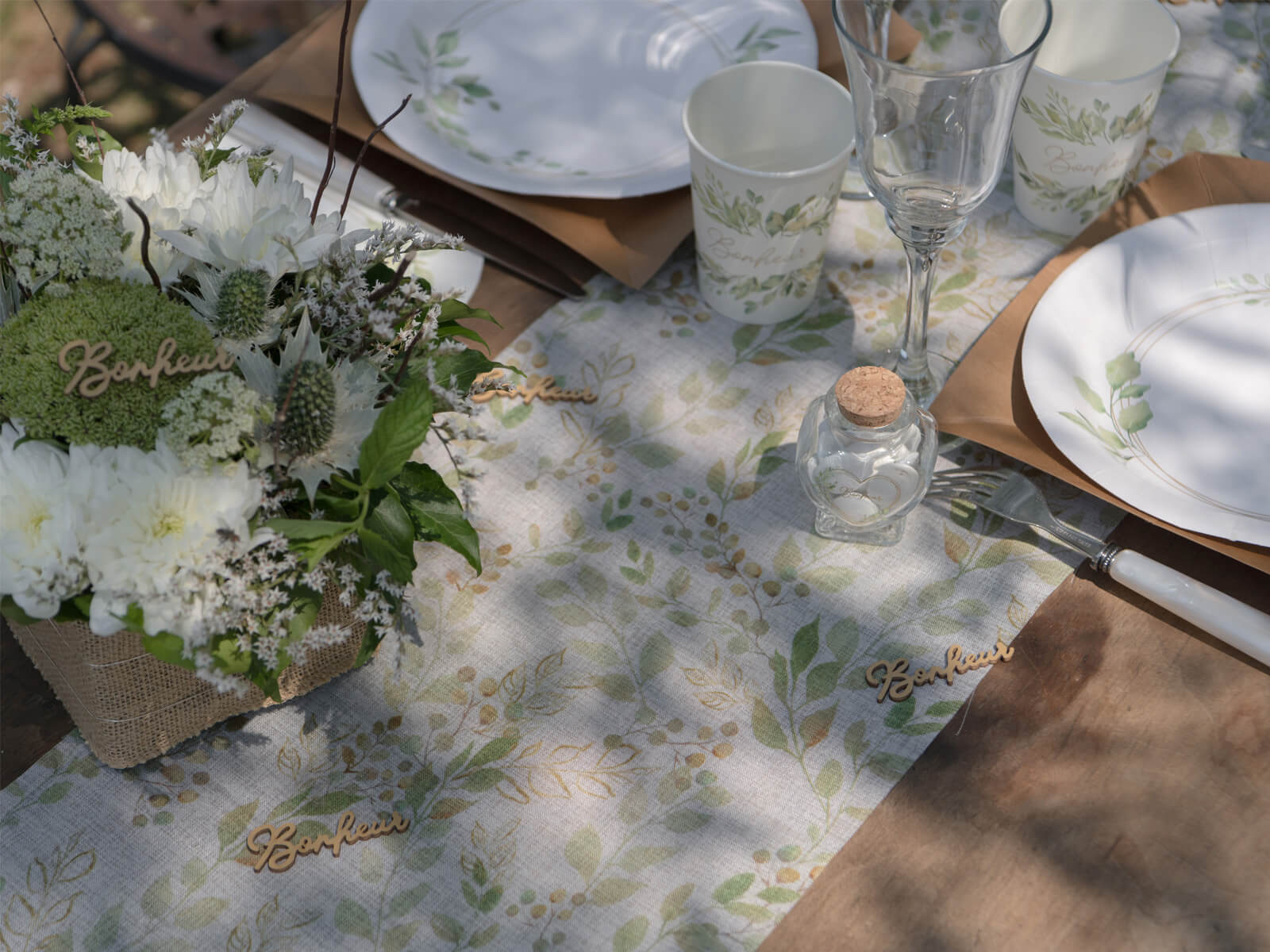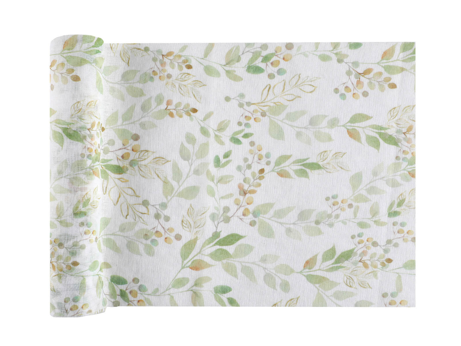 • Asztali futó zöld és arany levelek nyomtatásával, ideális például babaköszöntő vagy születésnapi partira.