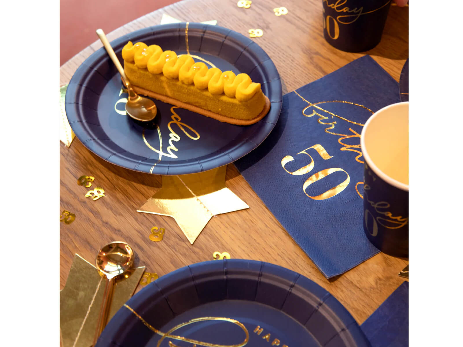 • Születésnapi szalvéták tengerészkék színben, aranyszínű fémes Happy Birthday 50 felirattal, tökéletes egy ötvenedik születésnapi partihoz.
