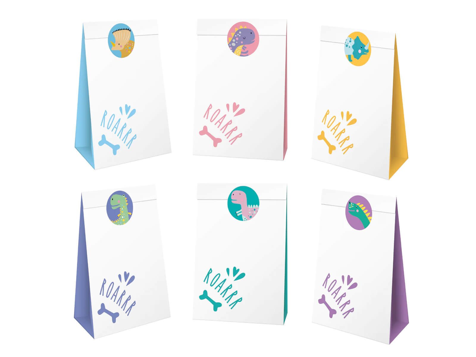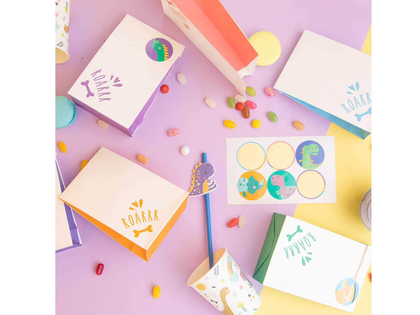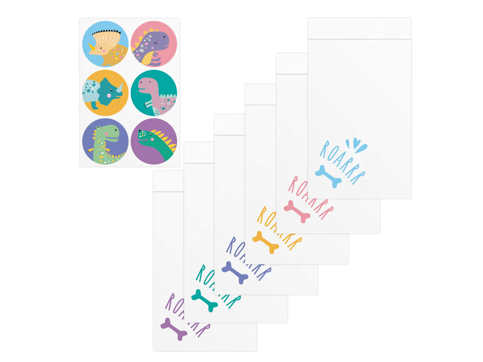 A készletet különböző dinoszauruszok formájú matricákkal együtt csomagolják, így a gyerekek extra szórakozást kapnak, hogy személyre szabhassák saját táskáikat vagy díszíthessék más tárgyakat a partin.