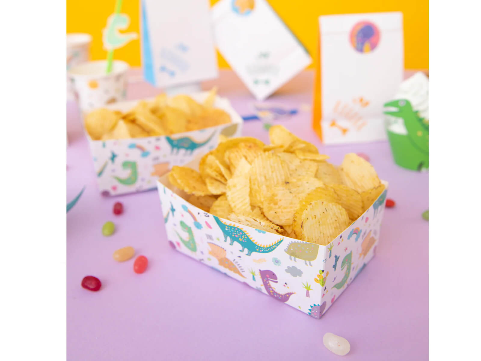 Utazzon el gyermekeivel a dinoszauruszok őskori világába a ropogtatnivalók és egyéb rágcsálnivalók praktikus és vonzó papírdobozainak köszönhetően. Tökéletes bármilyen gyerekzsúrhoz - a születésnapi partiktól a piknikekig, ezek a színes dinoszaurusz-témájú dobozok kreatív érintést adnak bármelyik asztalhoz.