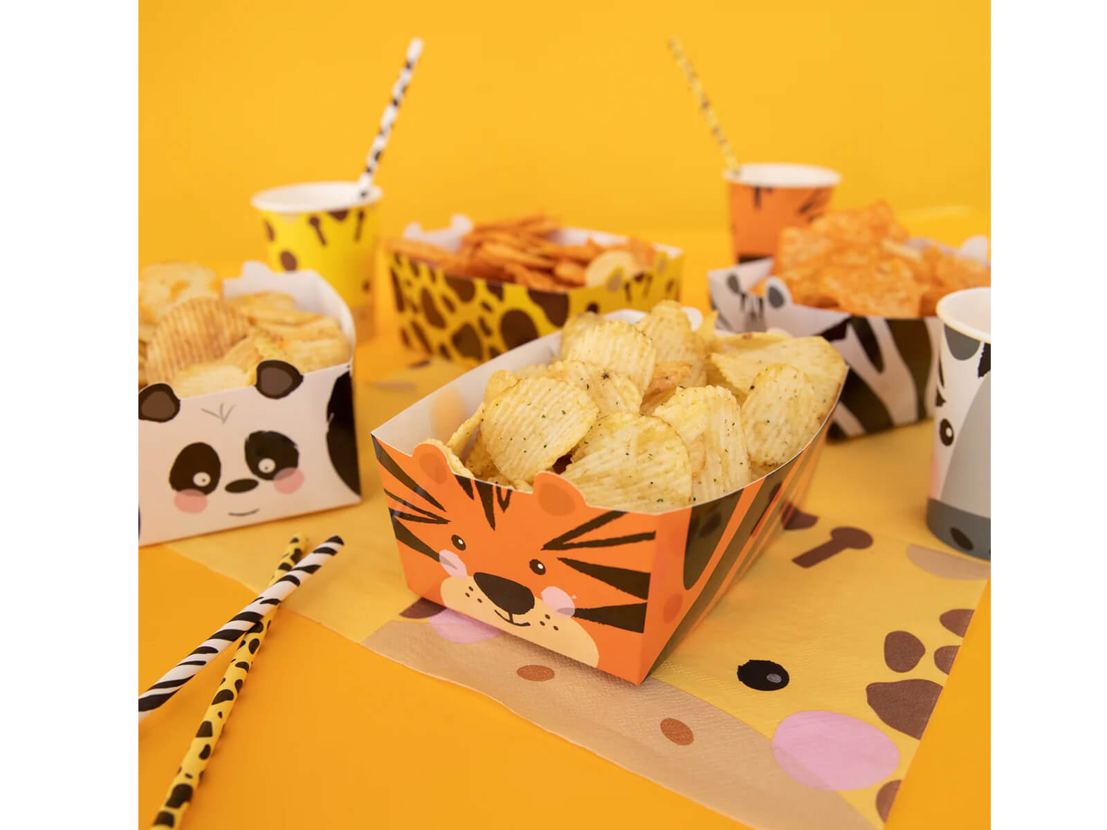 Vigye el gyermeke buliját a vad kalandok világába a mi papír chipses dobozok Állatok. Ezek a színes dobozok ideálisak nem csak a chipsek, hanem más rágcsálnivalók és édességek tálalásához is, és kedves színfoltot adnak bármely állatkerti vagy szafari témájú születésnapi partihoz. A készletben a következőket találja négy darab, amely könnyen elfér a kis vendégek számára készített snackek számára.