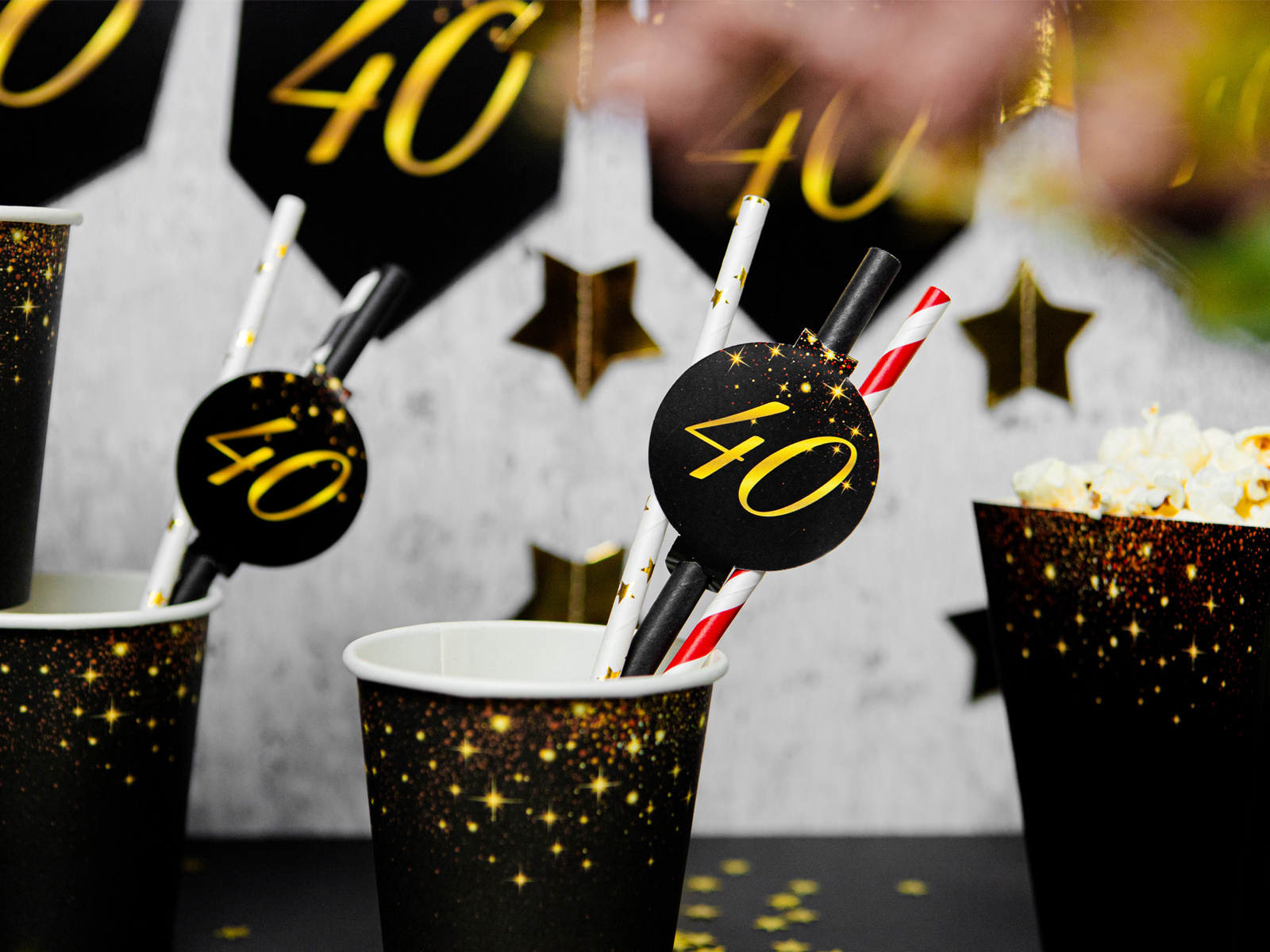 Hangsúlyozza a 40. születésnapja egyediségét ezekkel az elegáns fekete szívószálakkal a Sparkling. Ezek a stílusos, egyszerű szívószálak tökéletes kiegészítői bármilyen típusú italnak, a klasszikus koktéloktól a hűvös szénsavas italokig. Minden készlet a következőket tartalmazza 6 biológiailag lebomló szívószálak, így egyszerre praktikus és környezetbarát választás. A "40" számmal ellátott dekoratív medalionok egyedi jelleget kölcsönöznek mindegyiknek, így tökéletes asztaldíszek lesznek.