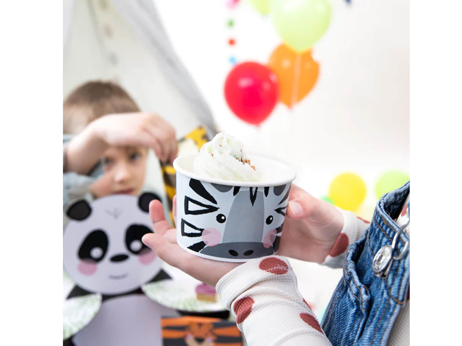 • Papír fagylaltos poharak állatok képével: tigris, zebra, panda és zsiráf.