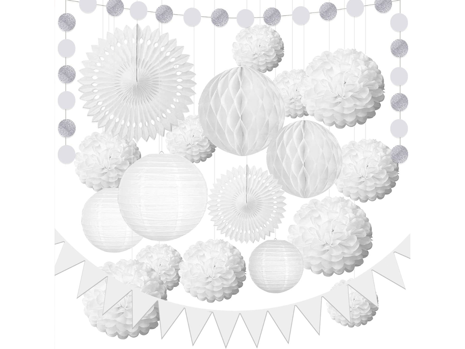 • Fehér dekorációs készlet, ideális esküvői termek díszítésére vagy az első szentáldozáshoz.