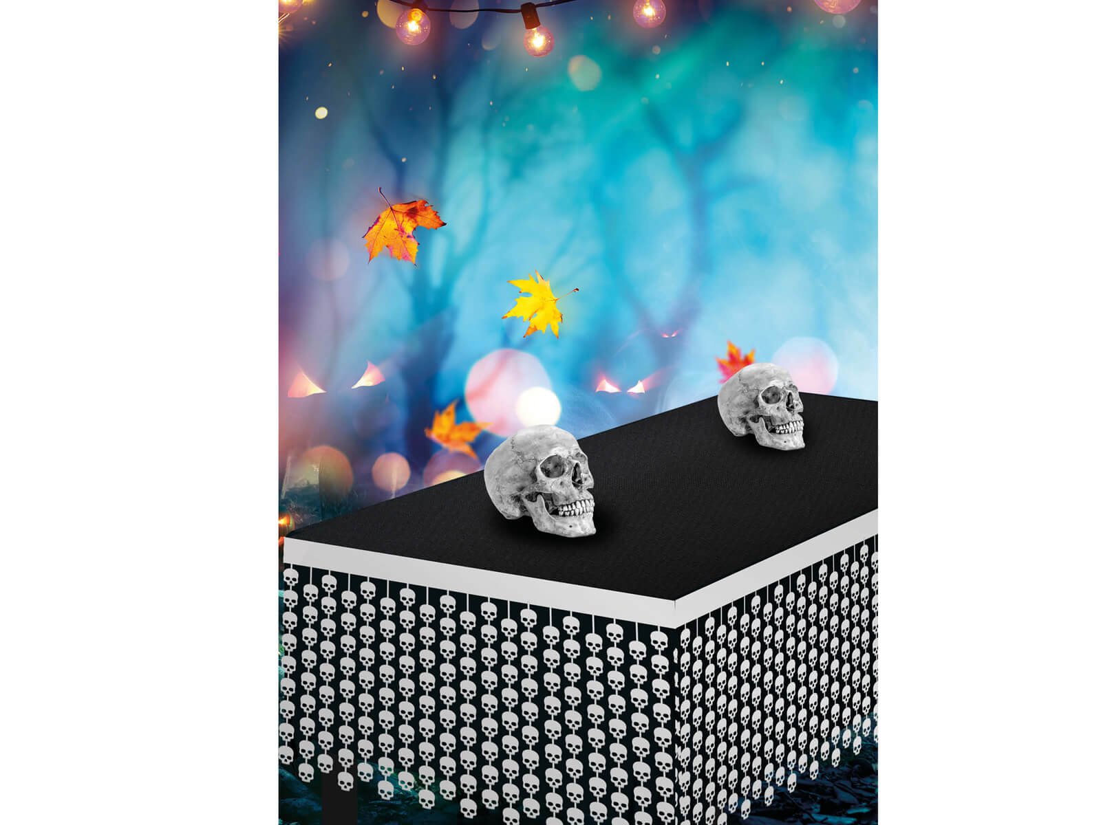 Ragadja meg vendégei figyelmét egy Halloween-stílusú partival, díszítve asztalát egy szokatlan, koponya motívummal ellátott szegéllyel. Ez az egyedülálló dekoratív akcentus ideális az asztalok szélén való használatra, titokzatos és kissé kísérteties jelleget kölcsönözve nekik. Tartós fóliából készült szegélyléc lenyűgöző méreteinek (70 x 400 cm) köszönhetően könnyen alkalmazkodik a különböző méretű és formájú asztalokhoz.
