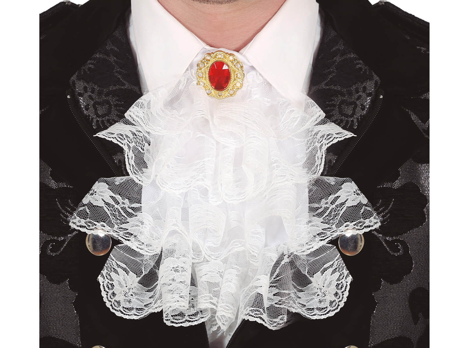 • Fehér csipke jabot arany brossal és piros ékszerekkel.