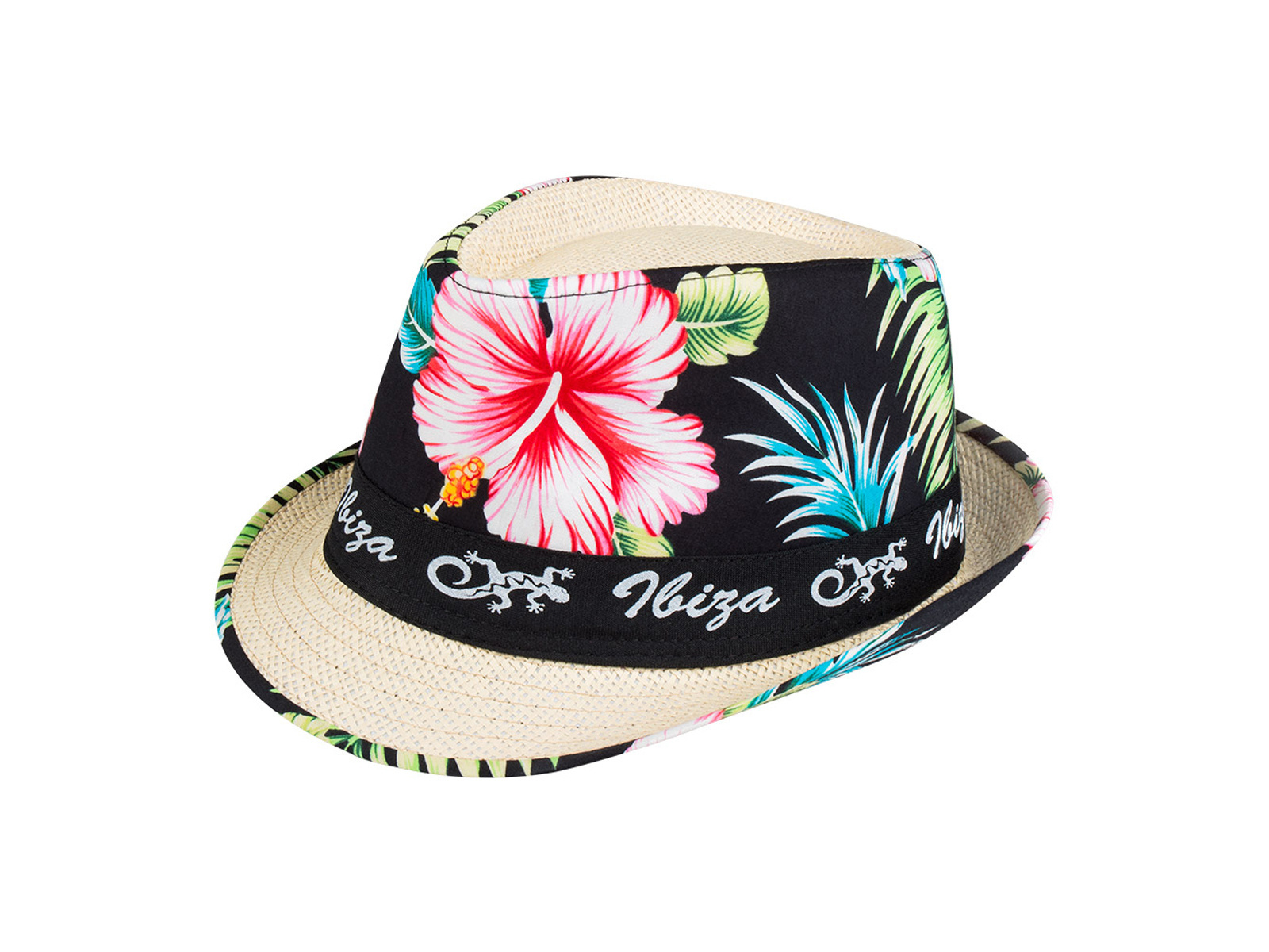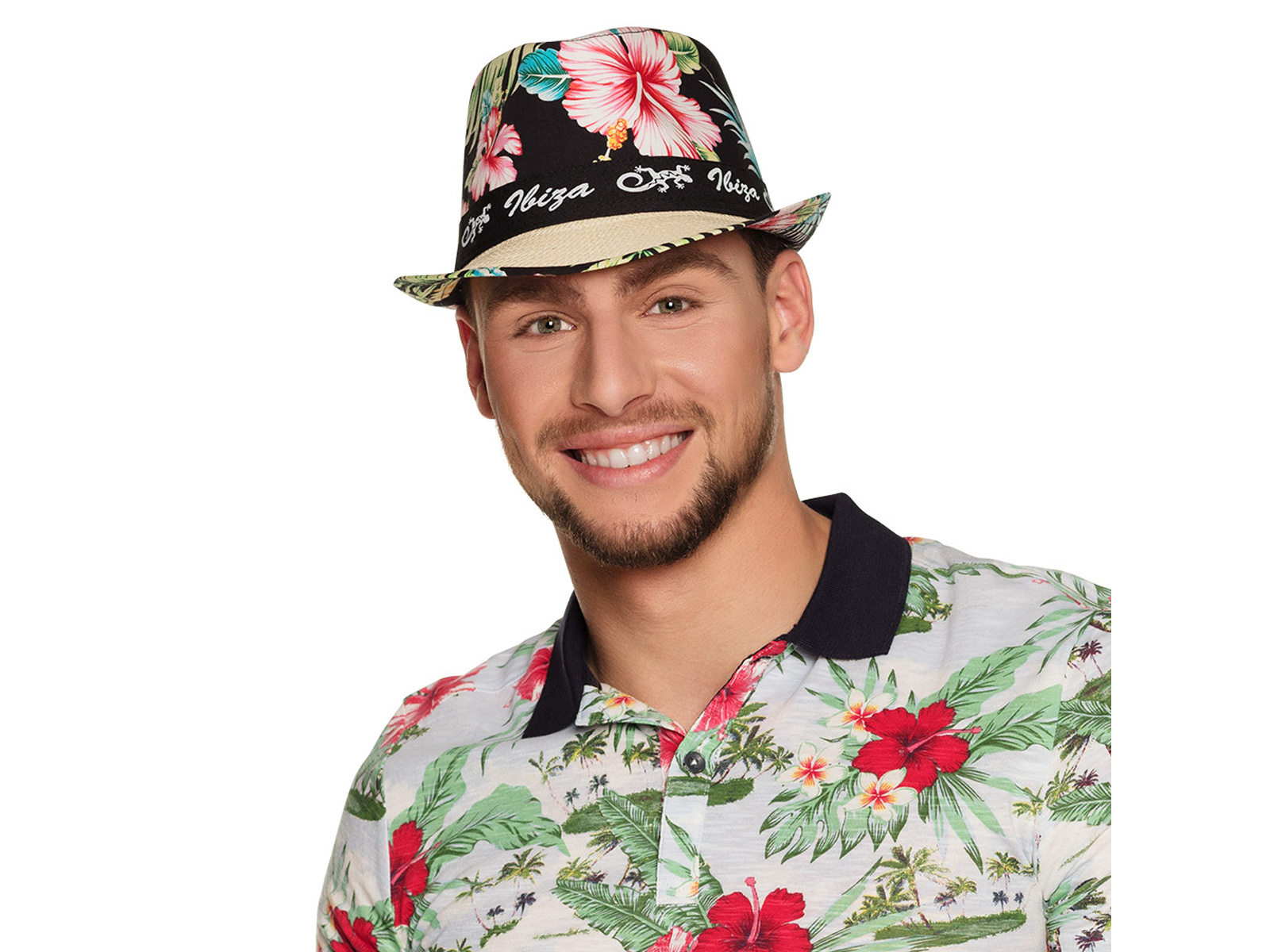 • Hawaii kalap hibiszkusz virágokkal és Ibiza felirattal.