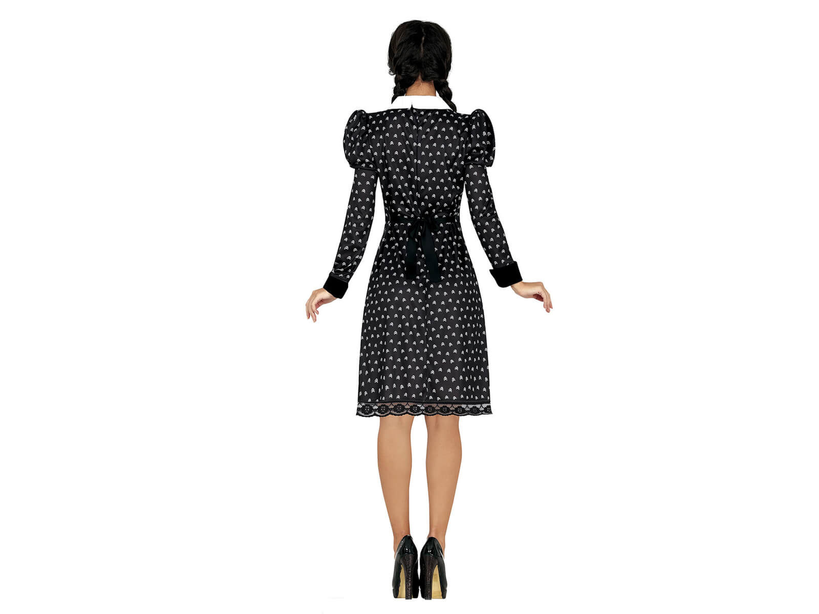 Merüljön el a gótikus álmok sötét világába a mi Gótikus iskoláslány jelmezünkkel. Ez az egyedi jelmez ideális Halloween, András napja és más tematikus partikra és különleges alkalmakra. Elegáns fekete ruha, amelyet megkülönböztető nyomtatás díszít, minden eseményen kiemelkedik. A fehér gallér és a fekete mandzsetta iskolai, klasszikus érzést kölcsönöz a ruhának, miközben fenntartja a gótikus, komor megjelenést.