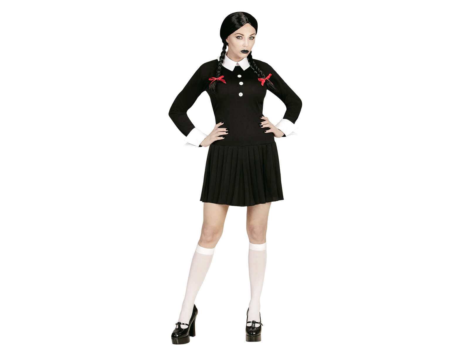 • A jelmez az Addams Familyből ismert Wednesday karakterére emlékeztet.