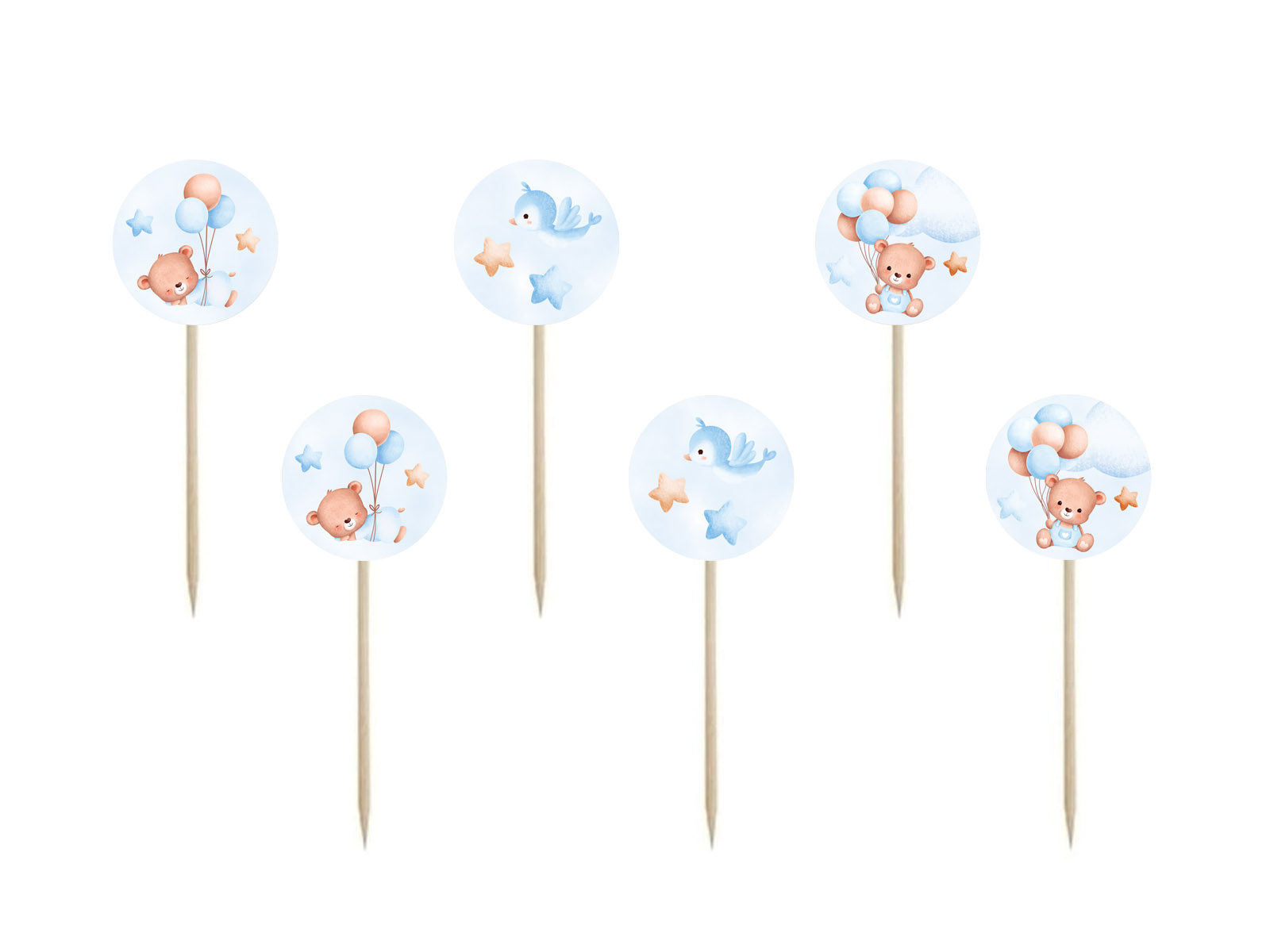 • Képek, kék színű csákányok lufikkal és mackókkal születésnapra vagy babaköszöntőre.