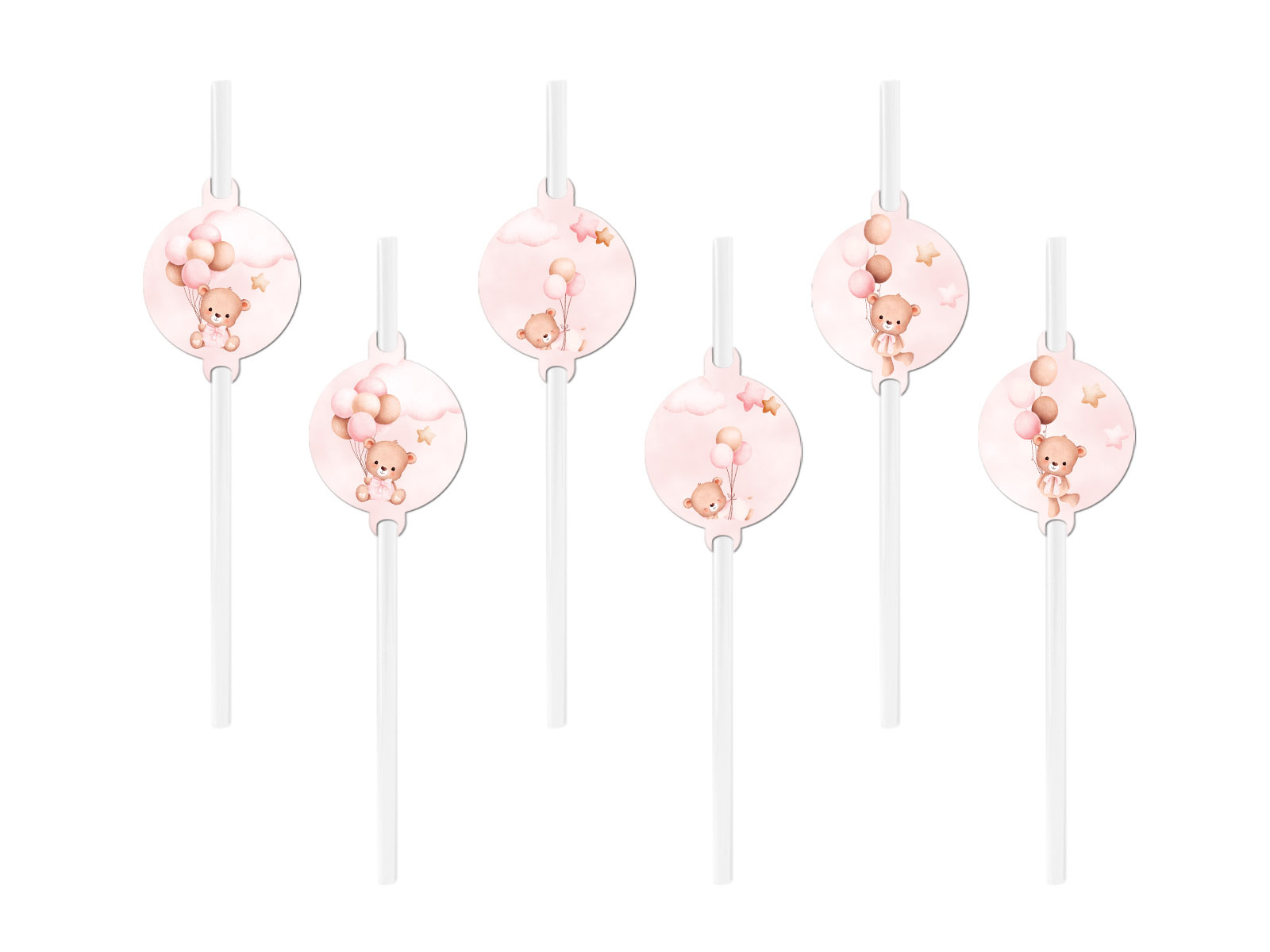 • Egyenes szívószálak rózsaszínben, lufikkal és mackókkal születésnapi vagy babaköszöntőre.