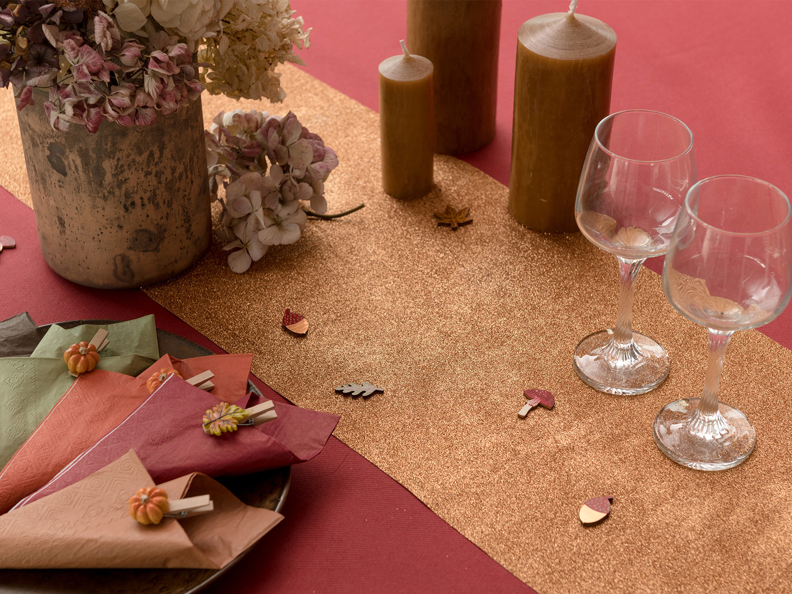 • Rézszínű csillámos asztali futó poliészterből készült.
