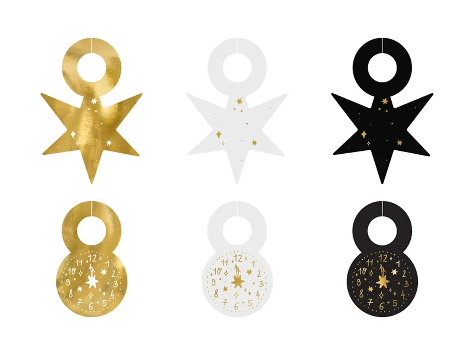 Üdvözölje az új évet stílusosan az eredeti üveg topperekkel. Ideális az italok címkézéséhez a szilveszteri parti során, így minden vendég könnyen megtalálja a poharát. Mindegyik topper egy bájos csillag alakú, elegánsan nyomtatott óra motívummal készült, amely az éjfélig tartó visszaszámlálást szimbolizálja.