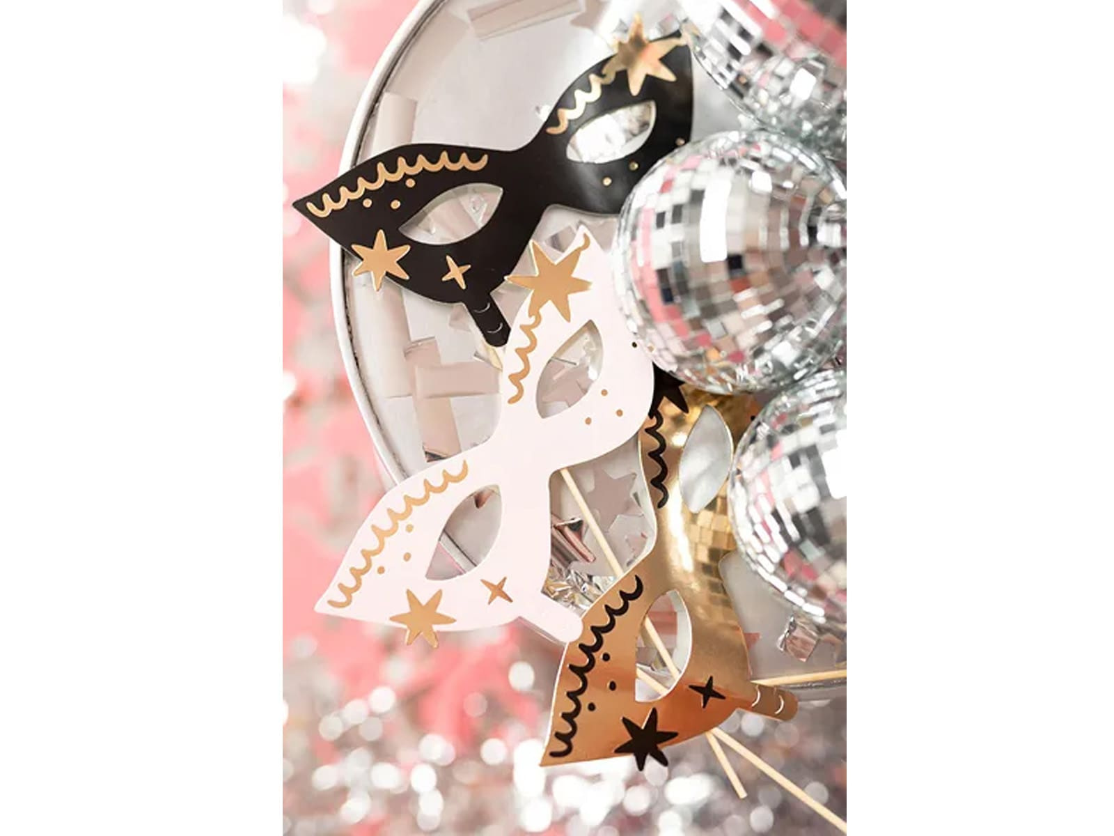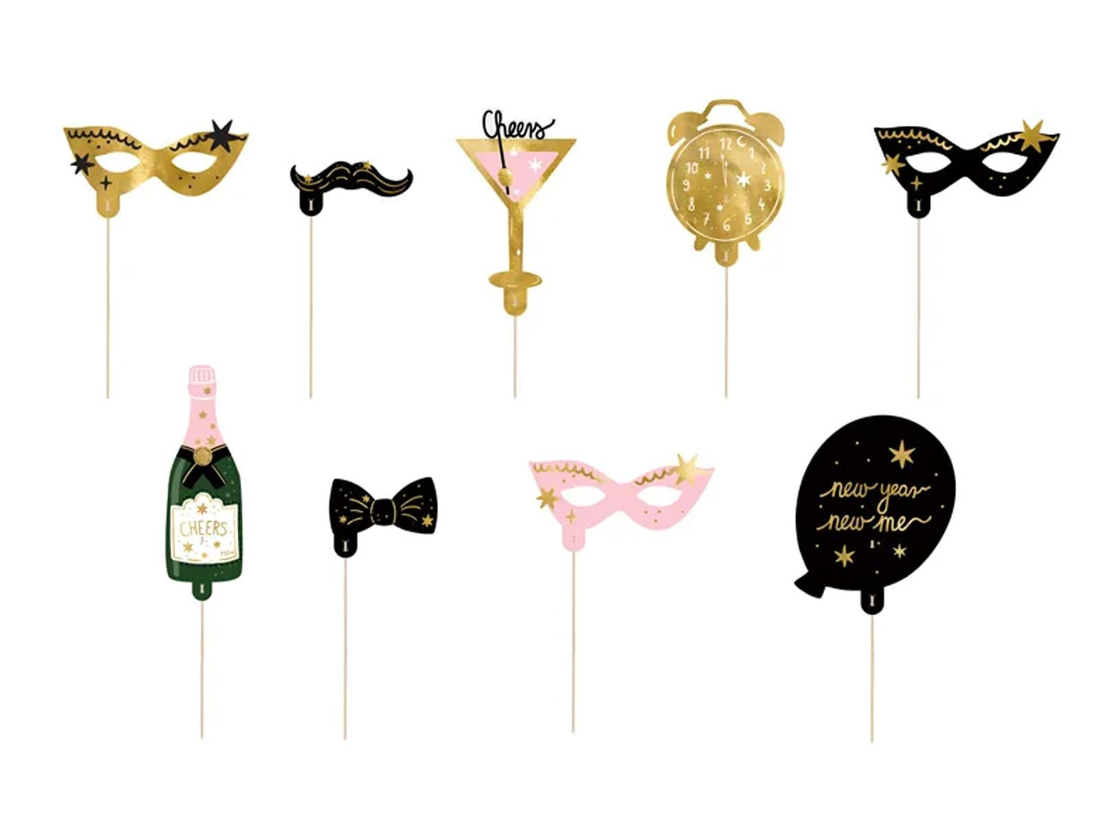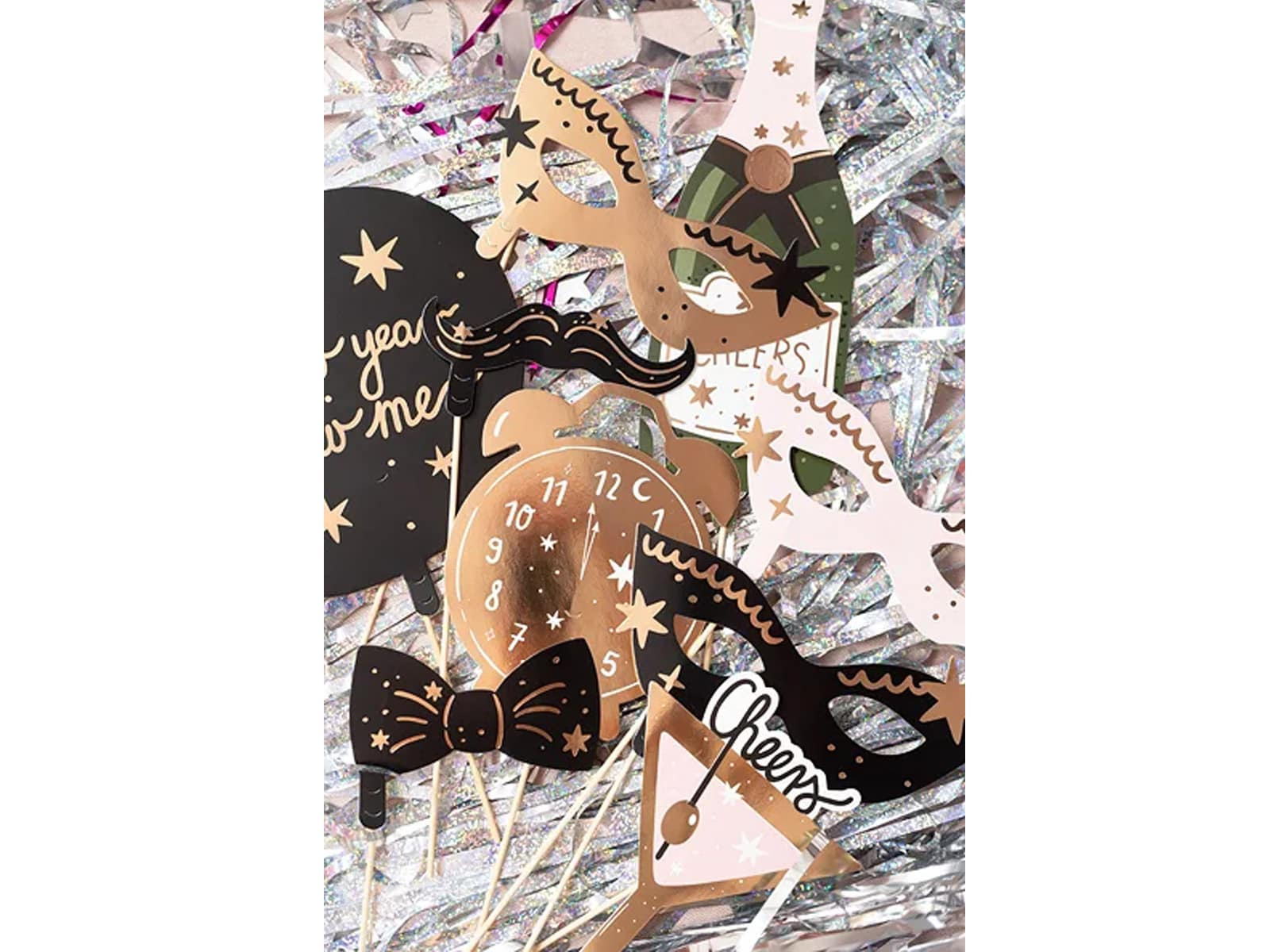 A készlet a következőket tartalmazza 9 különböző darab: elegáns maszkok az arany, a fekete és a rózsaszín árnyalataiban, egy játékos bajusz, egy elegáns pohár, egy szimbolikus óra, amely éjfélig visszaszámol, egy üveg pezsgő, egy légy és egy lufi a "new year new me" motivációs mondattal. Minden egyes elem kiváló minőségű papírból készült, ami garantálja a tartósságot és a fotókon való nagyszerű megjelenést.