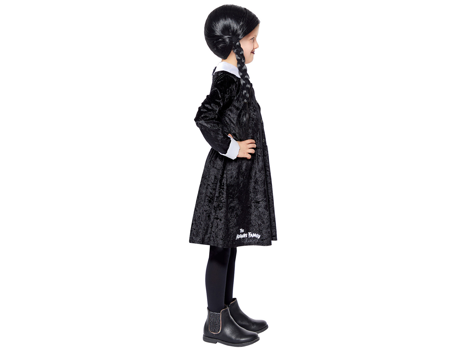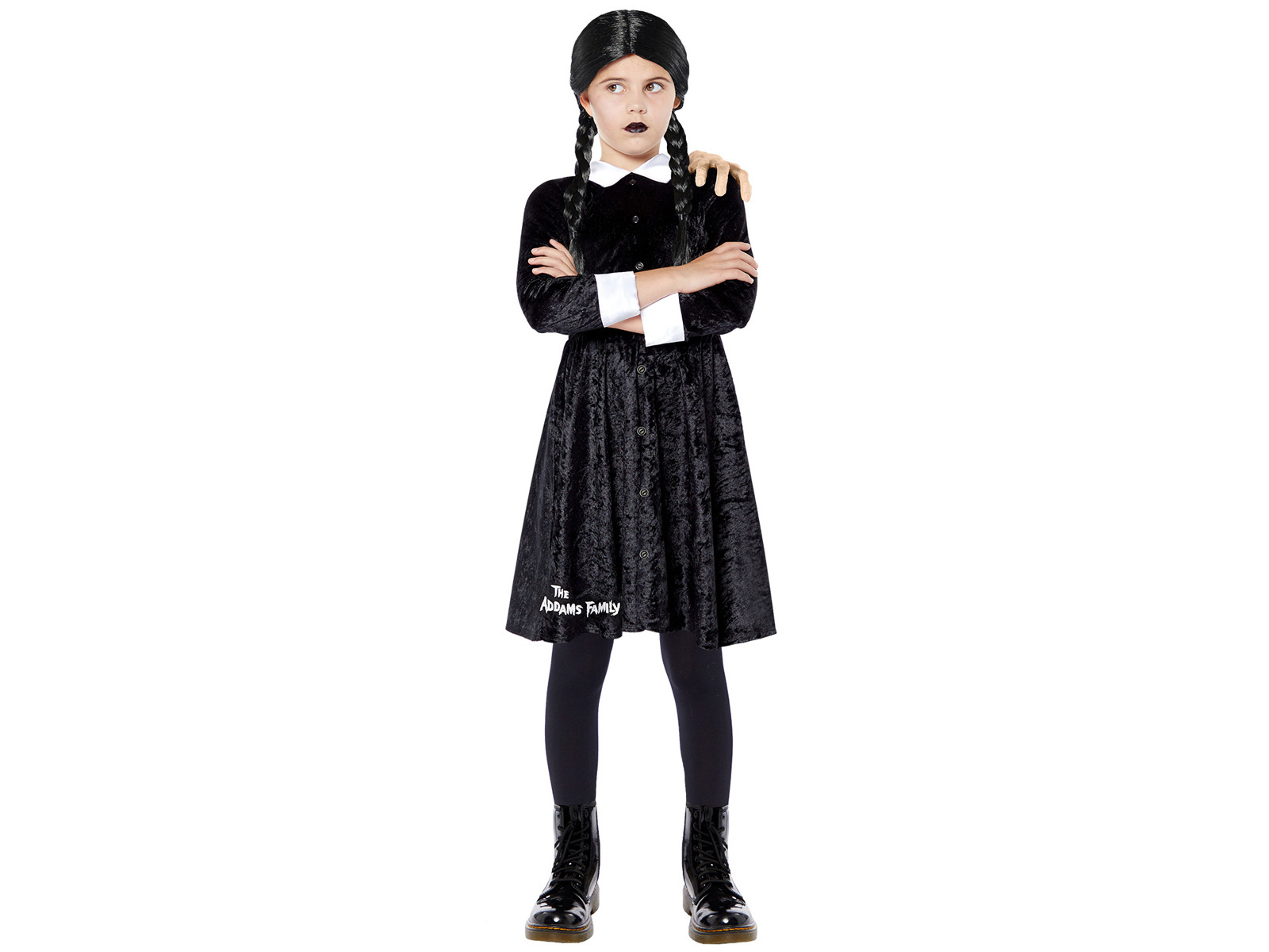 A jelmez egy jellegzetes fekete ruhából áll, fehér gallérral, amely az Addams család fiatal szerdájának kinézetét utánozza. Ezenkívül a készlet tartalmaz egy fekete parókát is, amely tökéletesen kiegészíti az egész megjelenést, így a stílus teljes és hiteles.