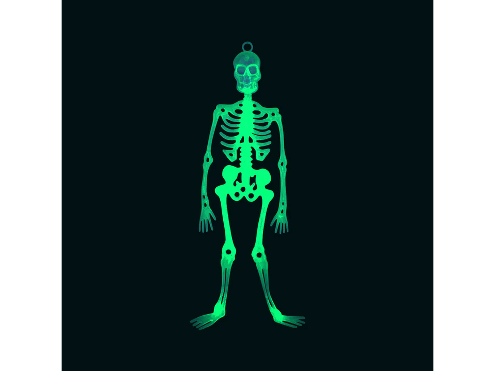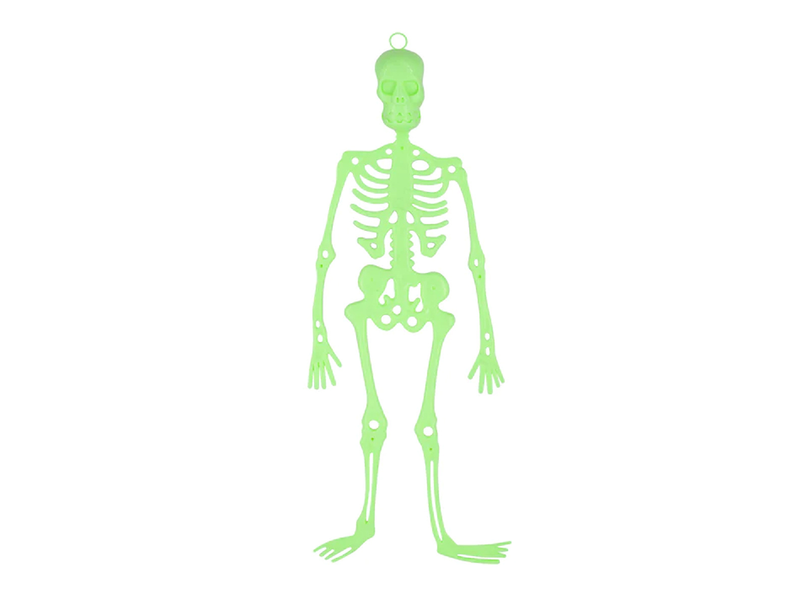 Hagyja, hogy az otthona a félelem hátborzongató légkörét az év legrémisztőbb éjszakáján a csontvázakra akasztott dekorációnkkal! Ez az egyedülálló csontváz világít a sötétben, sötét fényt adva, amely tökéletes a halloweeni hangulathoz. Magassága 33 cm, ami eléggé láthatóvá teszi ahhoz, hogy a bejáratokból vagy a szobák sarkaiból is szemet szúrjon.