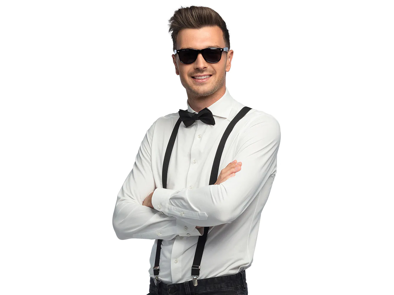 Lepjen meg mindenkit rendkívüli stílussal a mi Fekete kiegészítő készletünkkel! Tökéletesen szabott mindenkinek, aki eleganciát szeretne kölcsönözni az öltözékének, bármilyen alkalomra is legyen az. A készlet stílusos szemüveget, elegáns csokornyakkendőt és divatos nadrágtartót tartalmaz, amely bármilyen öltözéket kiegészít, a hétköznapoktól a különleges alkalmakig, például a leány- vagy legénybúcsúkig.