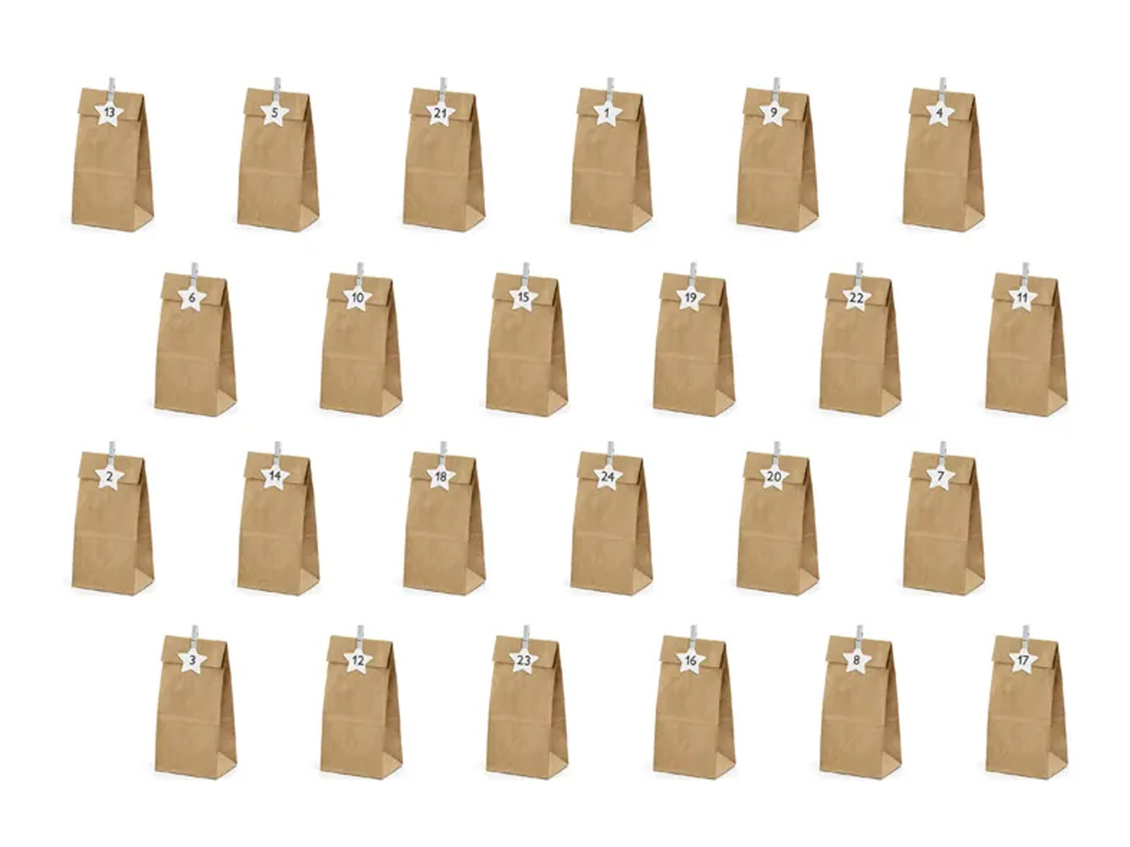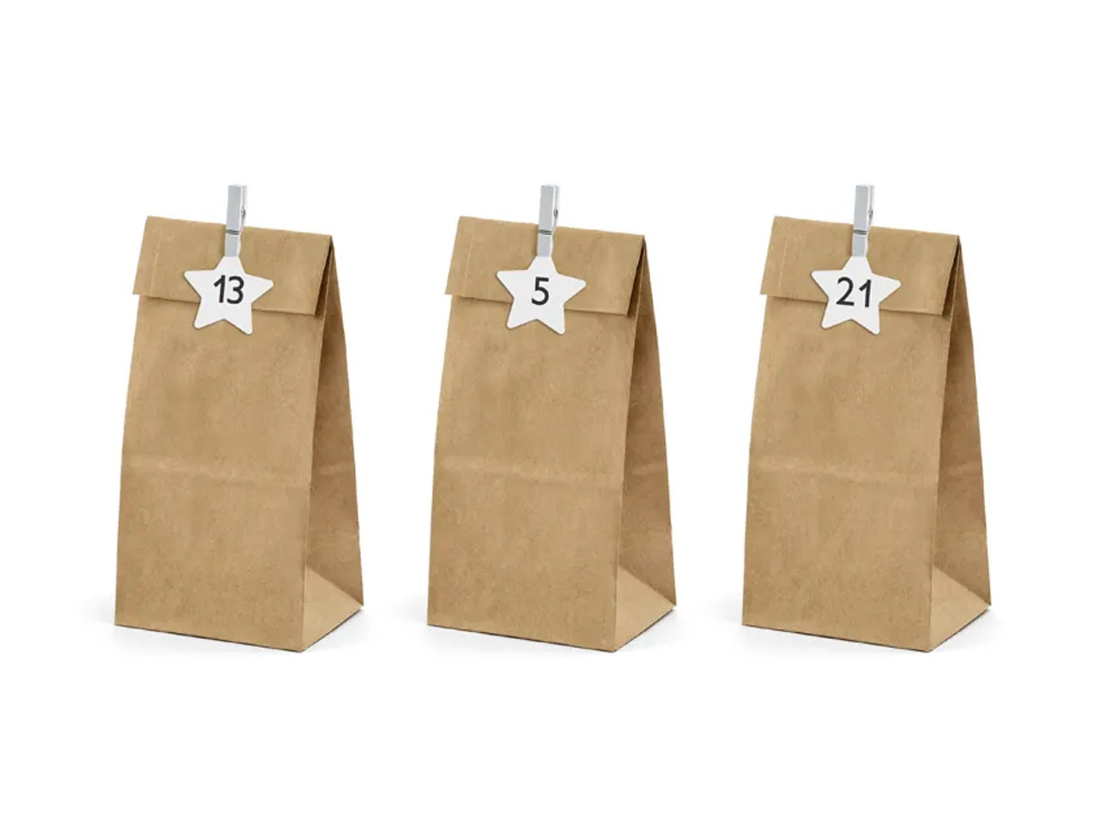 • A készlet tartalmazza: 24 papírzacskó, 24 csillag 1-től 24-ig terjedő számokkal, 24 fehér színű fa ruhacsipesz.