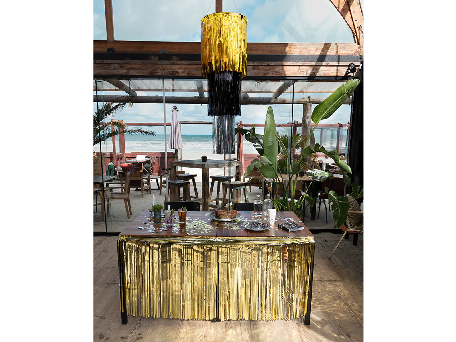 Dobja fel ünneplését a Lógó dekoráció Fólia csillár. Ez az elegáns dekoráció arany, fekete és ezüst árnyalatú fémfóliás rojtokkal rendelkezik, amelyek minden légmozgásnál csillognak. A 110 cm hosszúságot elérő fóliás csillár tökéletes választás a szobák díszítésére különböző alkalmakra, különösen ajánlott a következő helyekre Szilveszter vagy újévi partik.