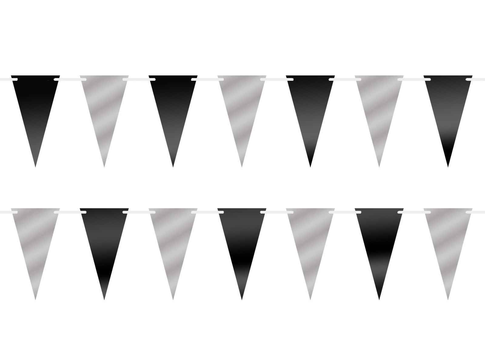 Emelje ki rendezvénye egyediségét a mi zászló füzérrel elegáns ezüst és fekete színekben. Ezt a bájos dekorációt kifejezetten különleges eseményekre, például szilveszterre, születésnapokra vagy legény- és leánybúcsúkra tervezték.
