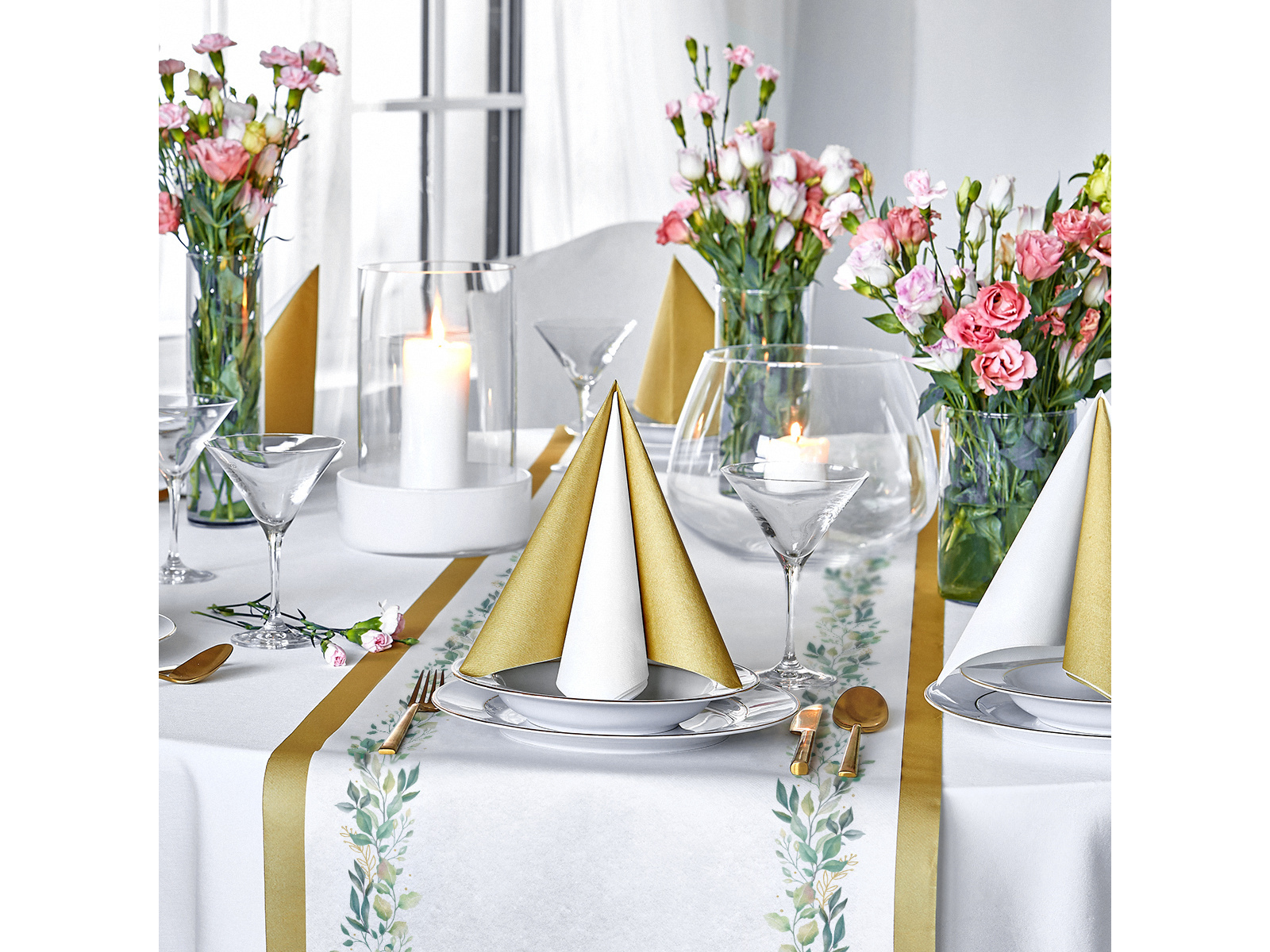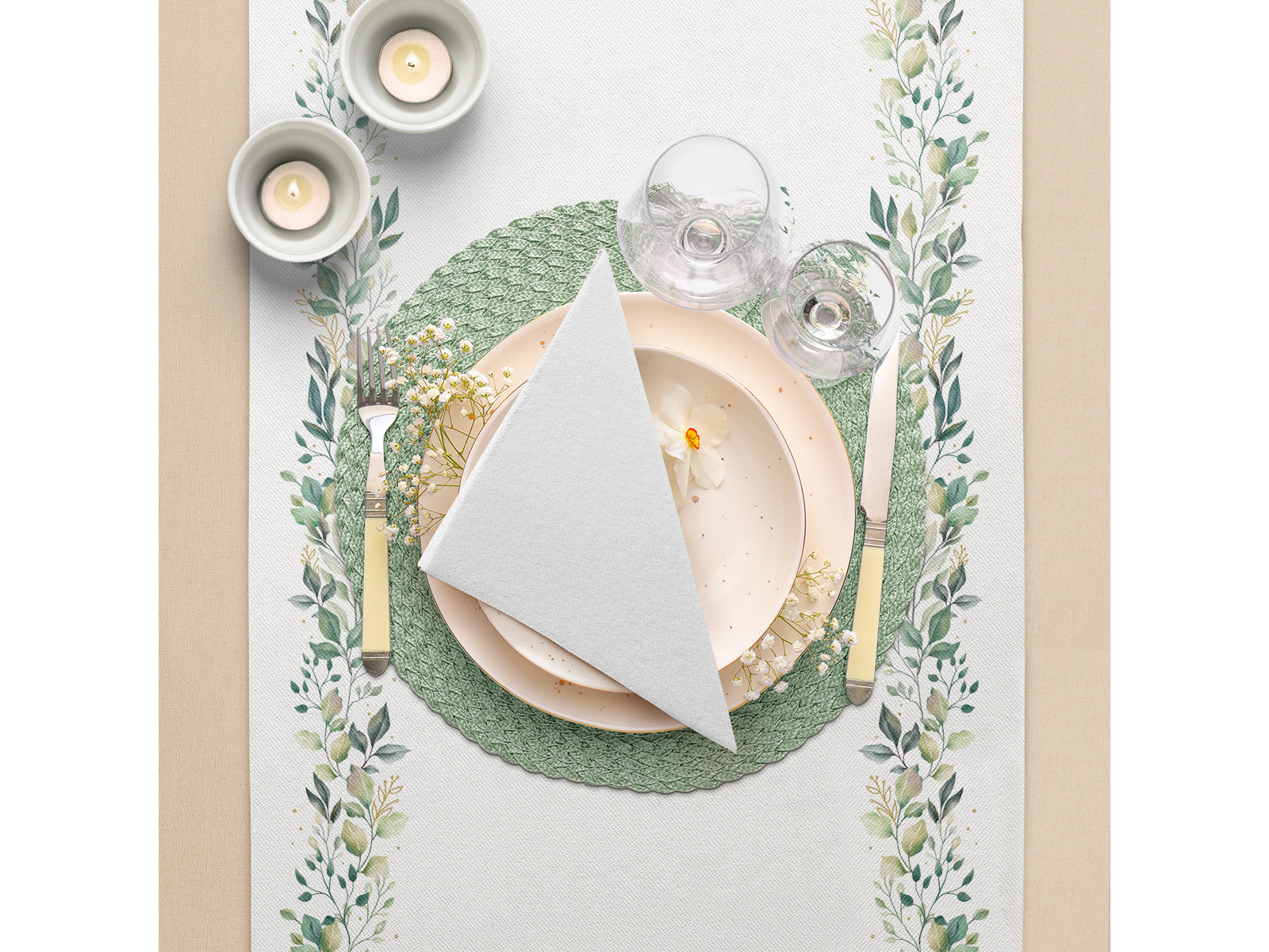 • Bieżnik dekoracyjny w kolorze białym z nadrukiem zielonych listków, idealny na uroczystość Pierwszej Komunii Świętej lub weselny stół.