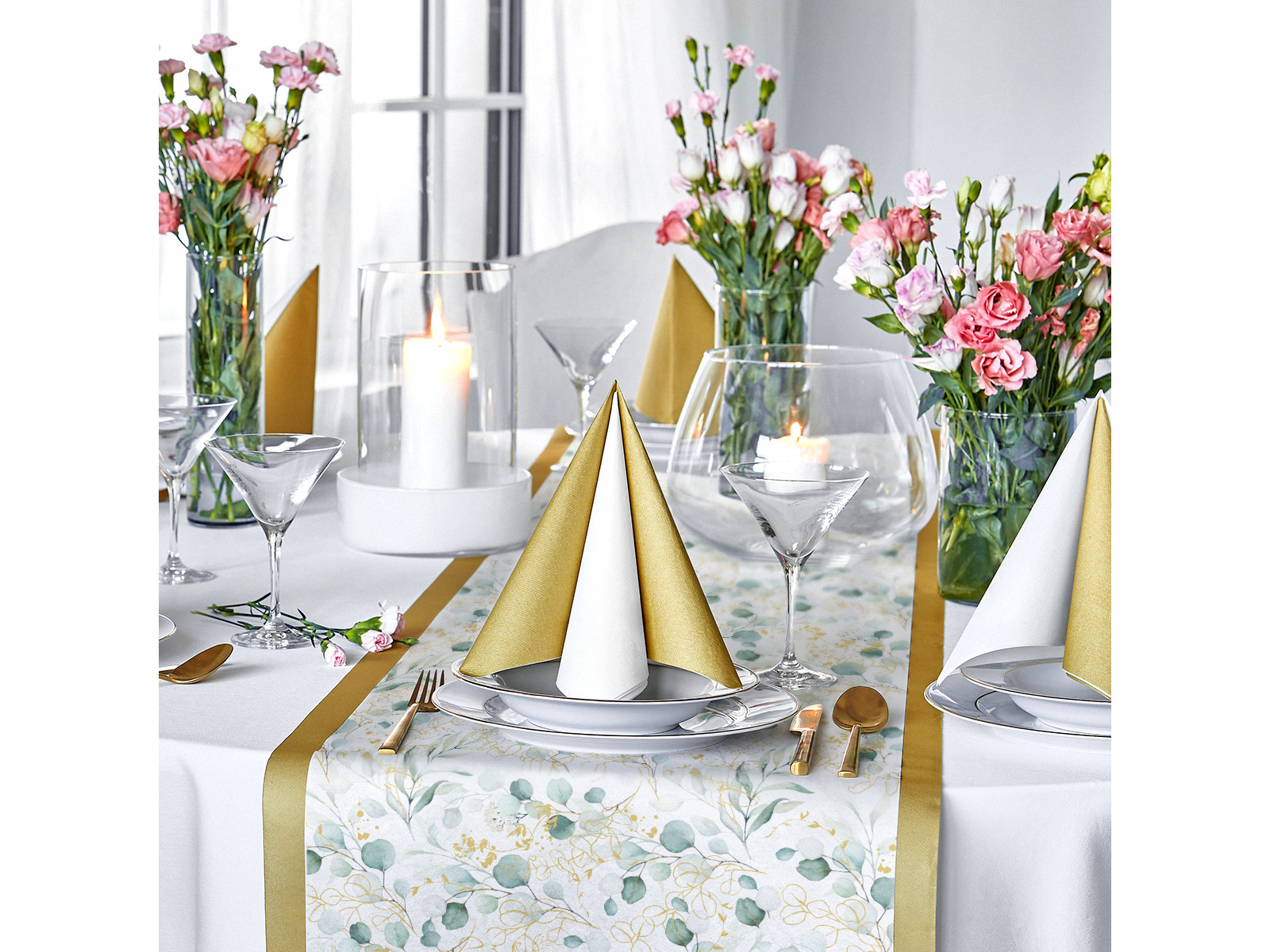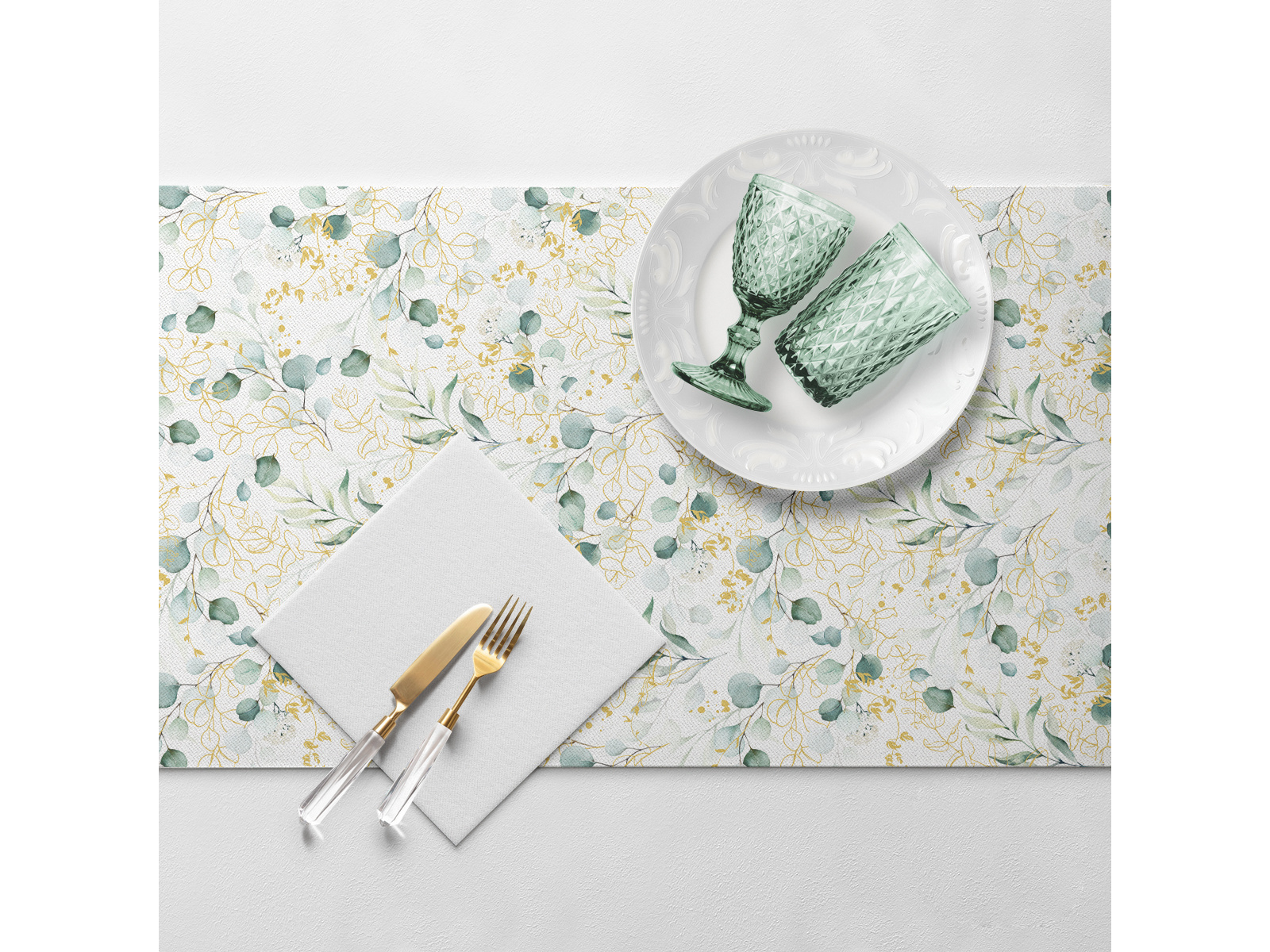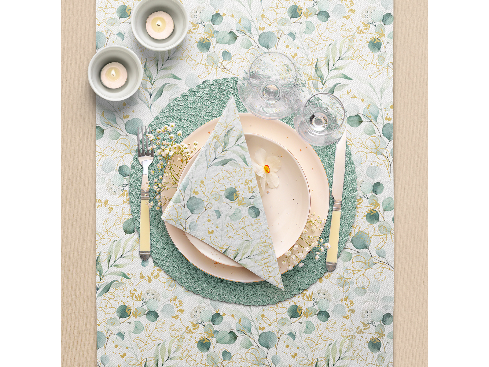 • Bieżnik dekoracyjny w kolorze białym z nadrukiem zielonych listków eukaliptusa, idealny na uroczystość Pierwszej Komunii Świętej lub weselny stół.