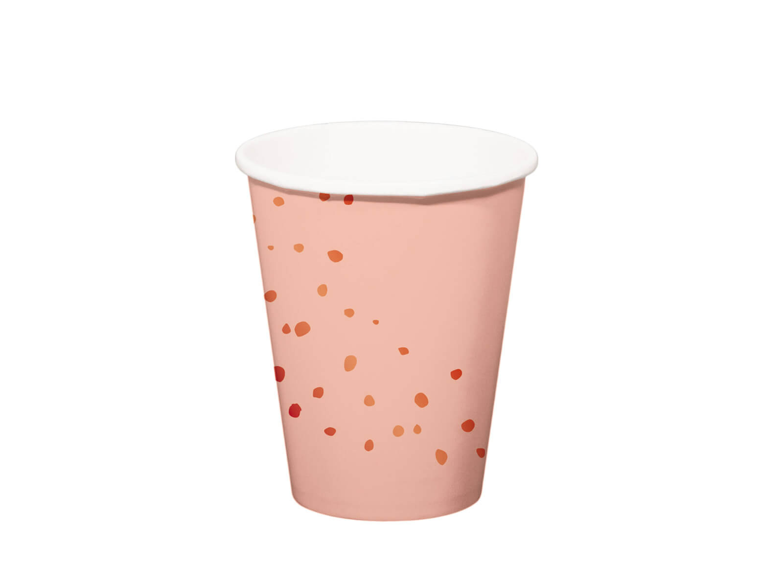 • Pasztell rózsaszínű születésnapi papírpoharak rózsaarany pöttyös nyomtatással az Elegant Lush Blush készletből.