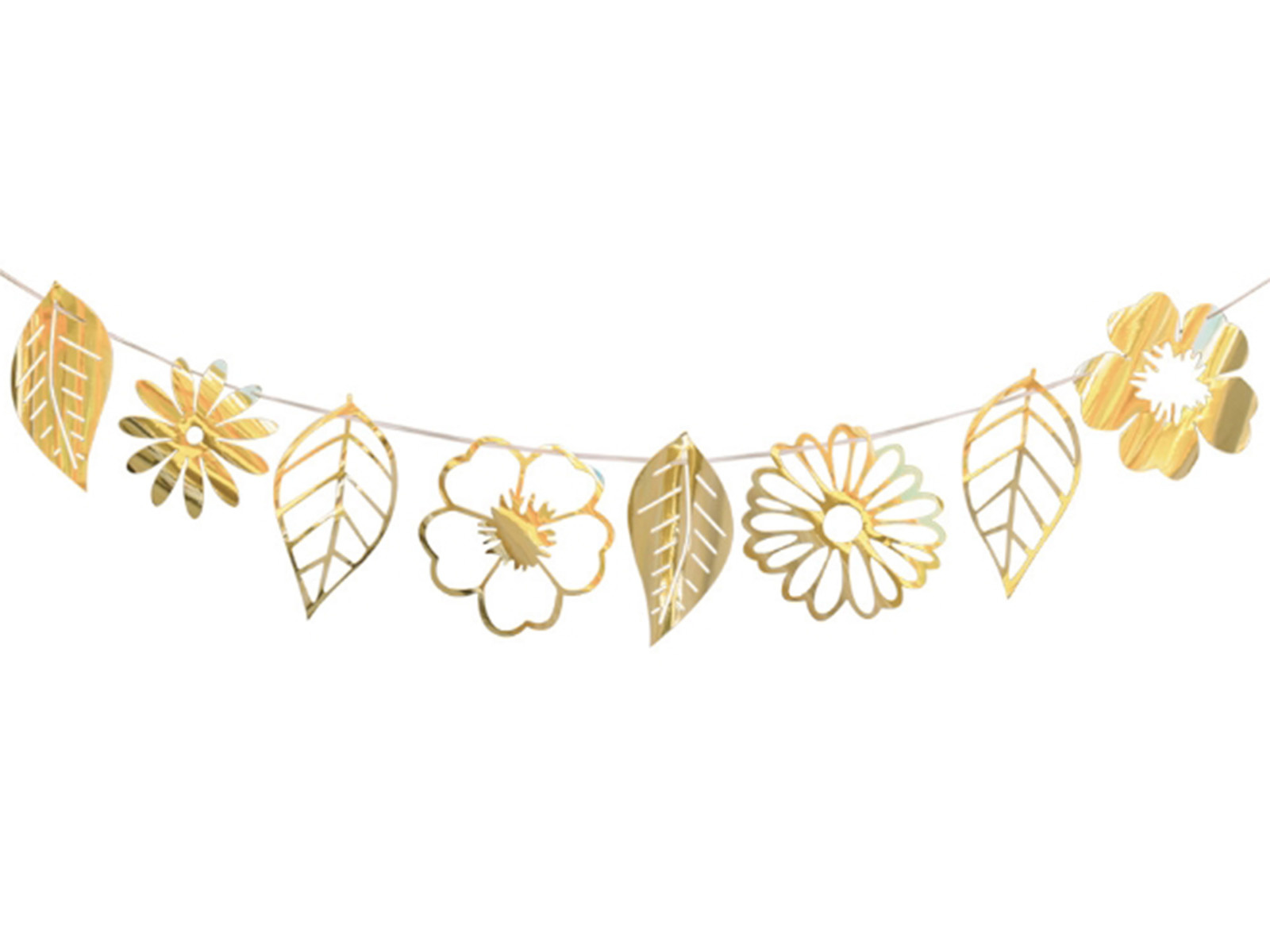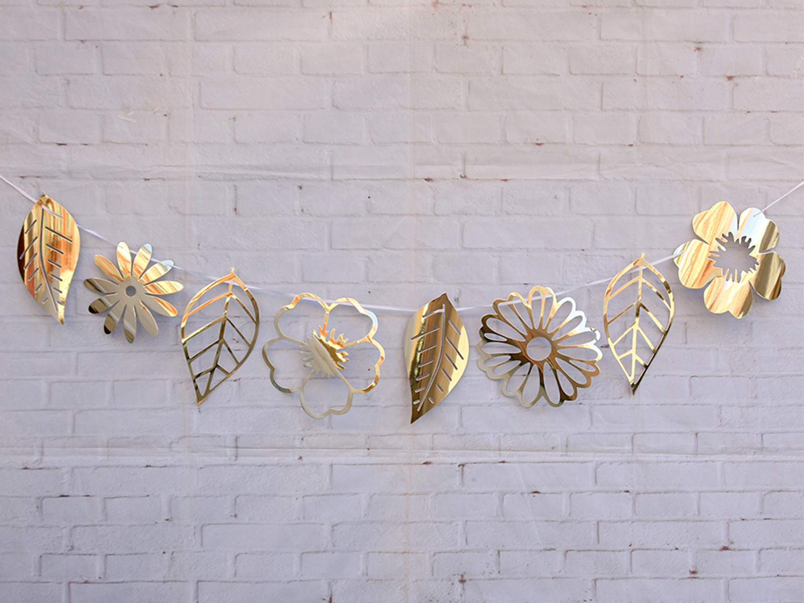 Felejthetetlen hangulatot teremt az Ön rendezvényén az arany virágfüzérrel. Tökéletesen reprodukálja a trópusi szigetek hangulatát, exkluzív hangulatot kölcsönözve bármilyen dekorációnak. A papírból készült füzér elegáns leveleket és virágokat tartalmaz, amelyek aranyszínű színe gyönyörűen tükrözi a fényt, így lenyűgöző hatást kelt.