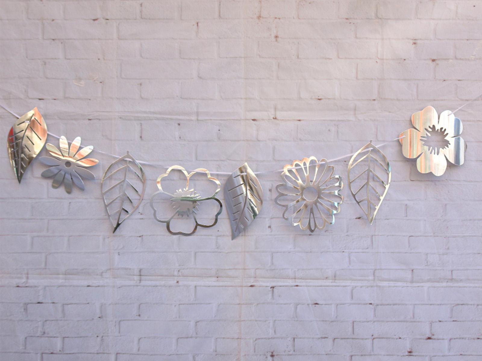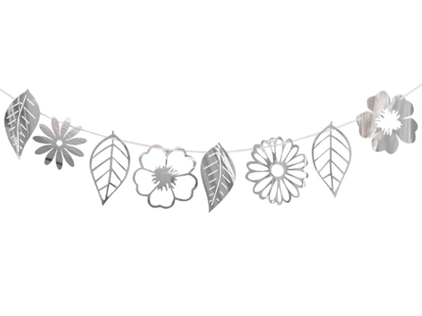 • Papírfüzér levelekkel és trópusi virágokkal, ezüst színben. A medálok közötti távolságok egymástól függetlenül változtathatók.