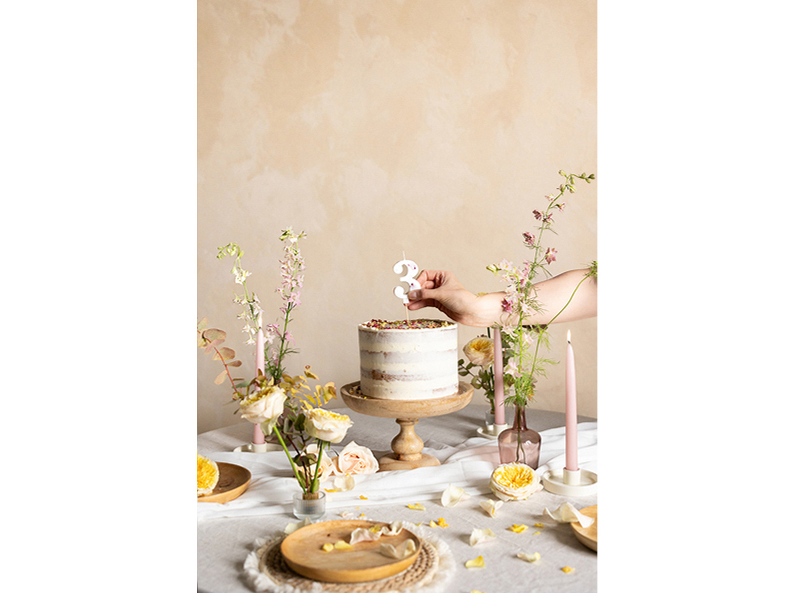 • Hármas számú születésnapi gyertya fehér színben, beágyazott virágszirmokkal.