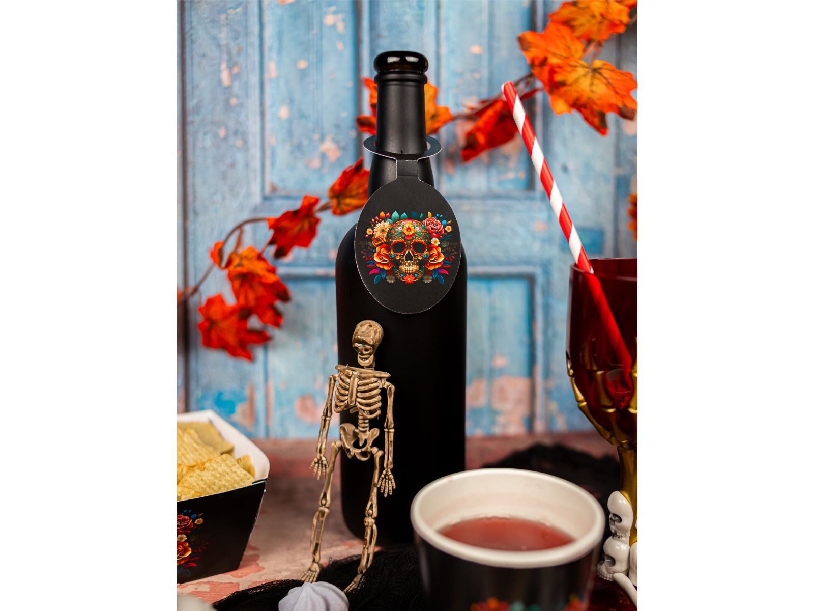 Ünnepelje a Halloweent mexikói stílusban a papír palack akasztókkal Dia De Los Muertos. Minden címke díszített egy mexikói koponya egyedi lenyomata, szimbolizálja ezt a színes és vibráló fesztivált. A készletben 8 medál található, a díszítés mérete 6 x 7,5 cm és az egész 6 x 13 cm.