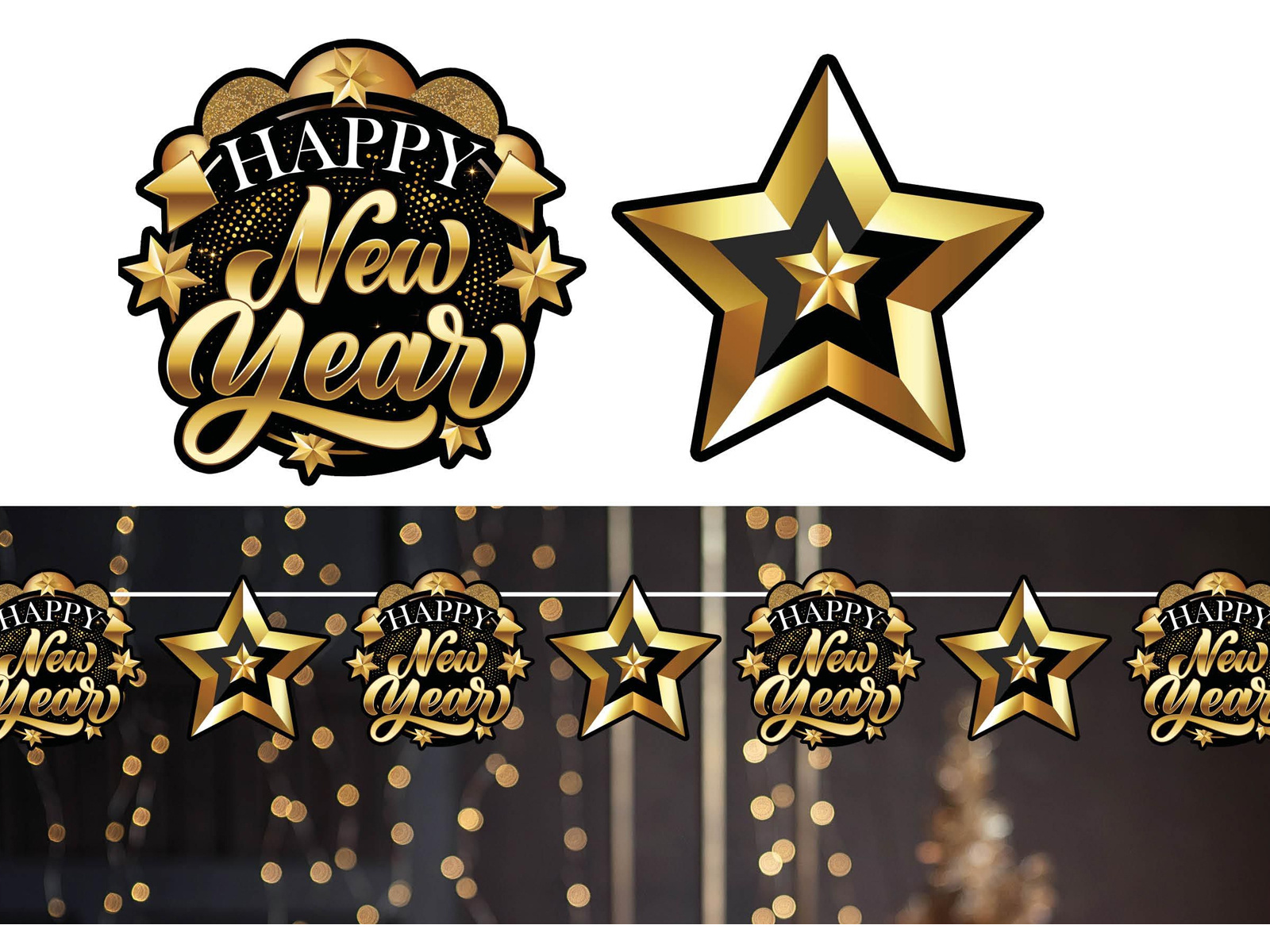 • Papírfüzér csillag alakú medálokkal és dekorációkkal a Boldog új évet felirattal.