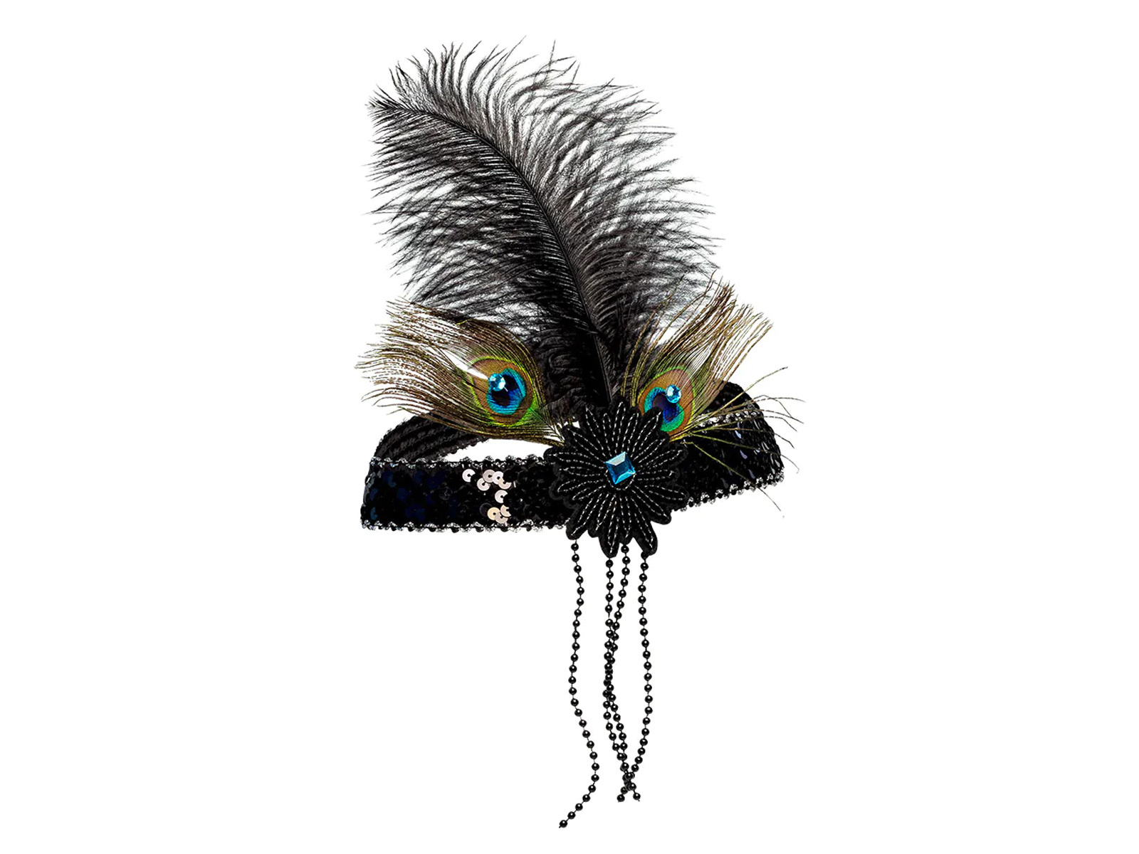Fedezze fel a különleges alkalmakra tökéletes stílusgyöngyszemet - Retro fekete tollas és gyöngyös fejpánt. Ez az 1920-as évek divatja által inspirált elegáns fejpánt nemcsak kifinomult megjelenést biztosít, hanem azt is biztosítja, hogy egész éjjel kényelmesen viselhesse. A részletekre való odafigyeléssel készült, nagy fekete tollal, pávatollakkal és virággal finoman díszítve, ami az egész kompozíciónak bájt kölcsönöz.