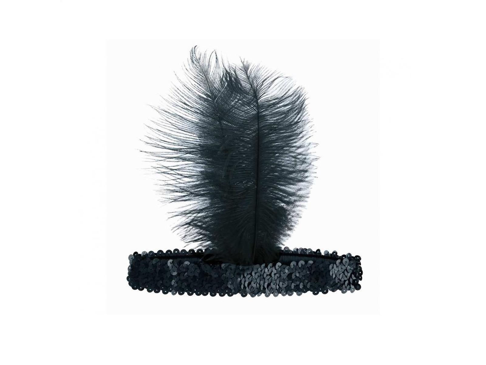 A különleges alkalmakra szánt ruhák elengedhetetlen kiegészítője - Retro tollas fejpánt fekete visszavisz a az 1920-as évek fényűző báljaira. Elegáns fekete anyagból készült, fekete flitterekkel és feltűnő tollal díszített, elegáns érintést ad bármelyik ruhához. Tökéletes kiegészítő szilveszterre, farsangra, leánybúcsúra vagy retro témájú bulira.