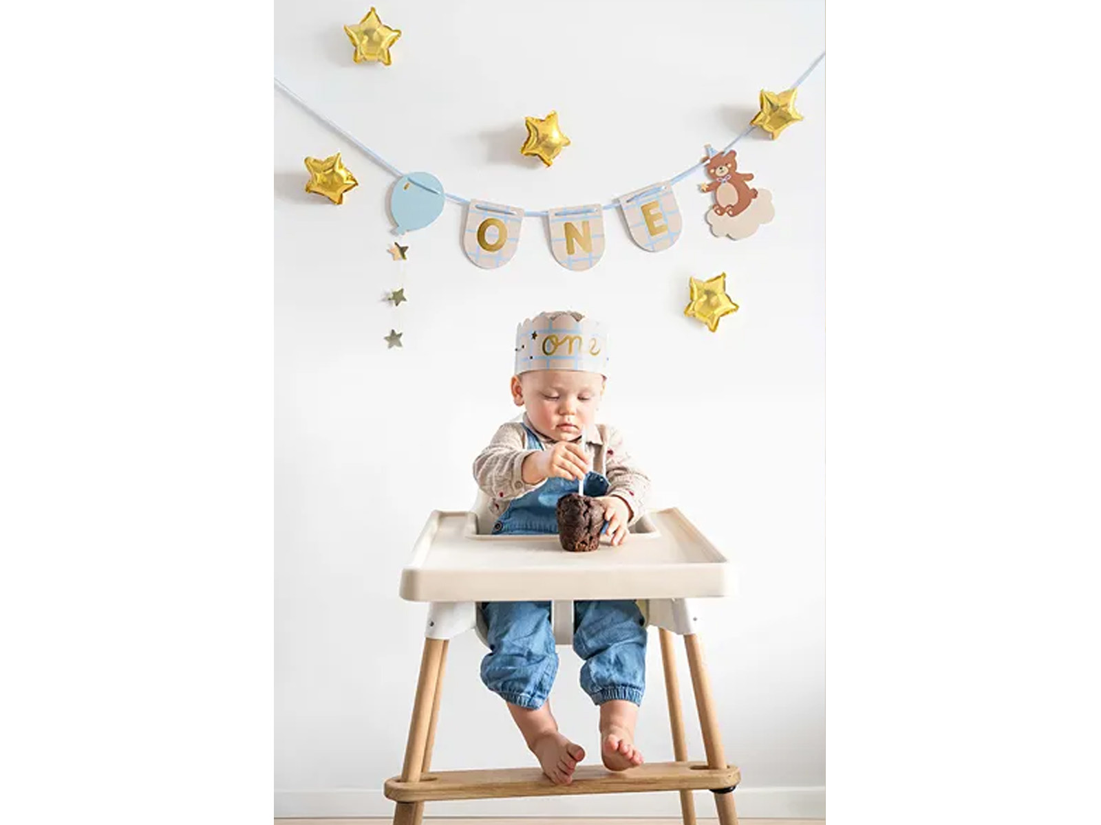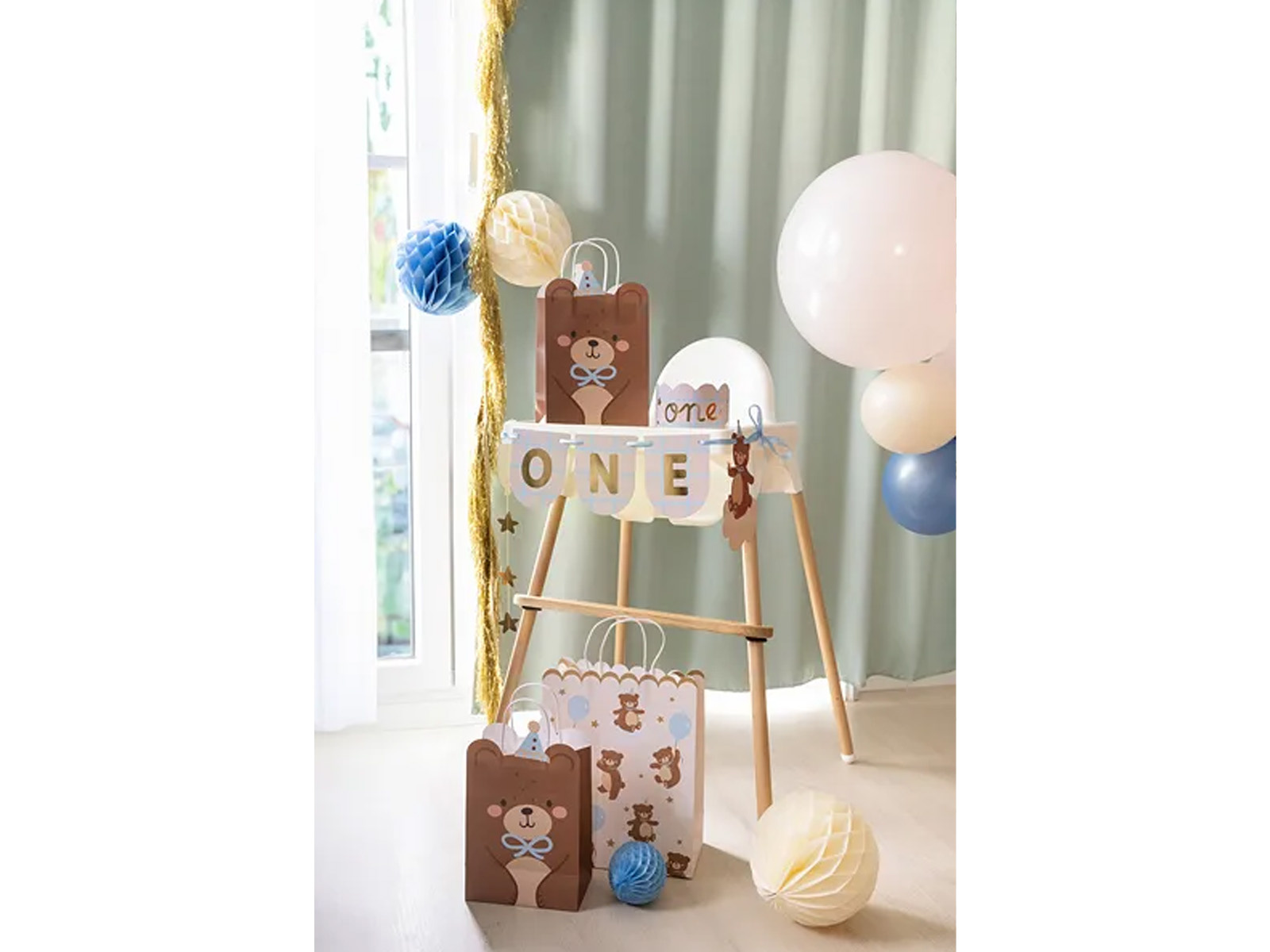 • Teddy maci szék transzparens 'One' és papír koronával.