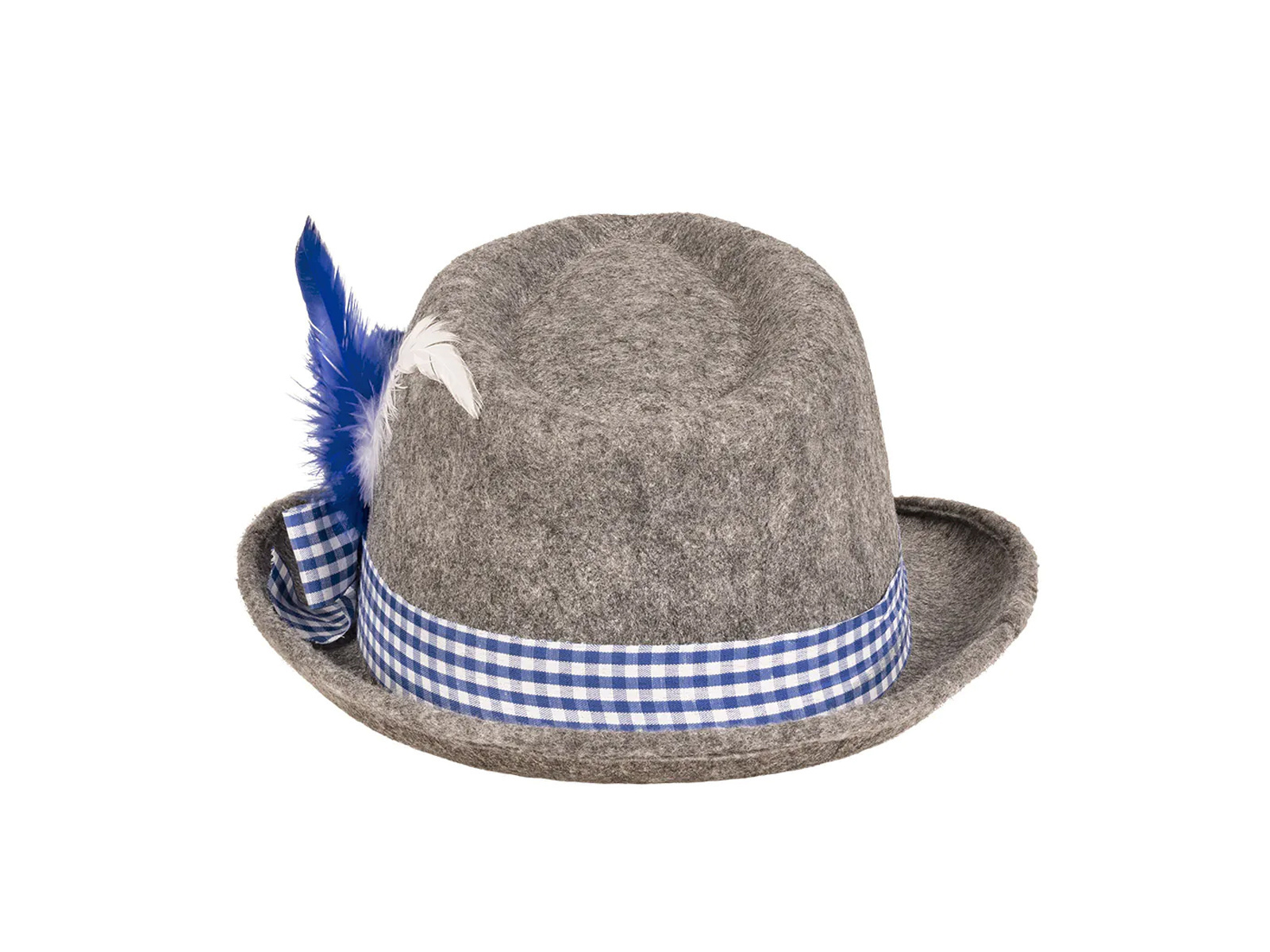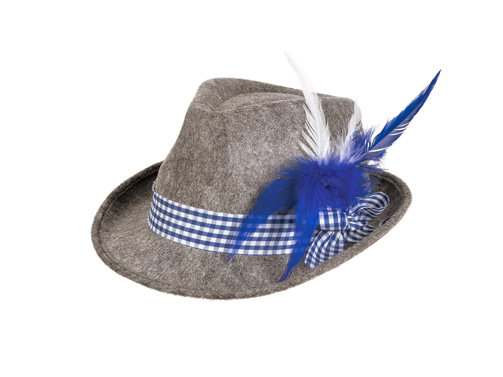 Csodáljon meg mindenkit egy egyedi tiroli kalappal, amely tökéletesen kiegészíti az Oktoberfest ruháját! Ez a stílusos, szürke árnyalatú sapka jellegzetes kék-fehér kockás szegéllyel díszített. További figyelemfelkeltő elem az elegáns masni és a feltűnő kék tollak, amelyek különlegessé teszik a kalapot.