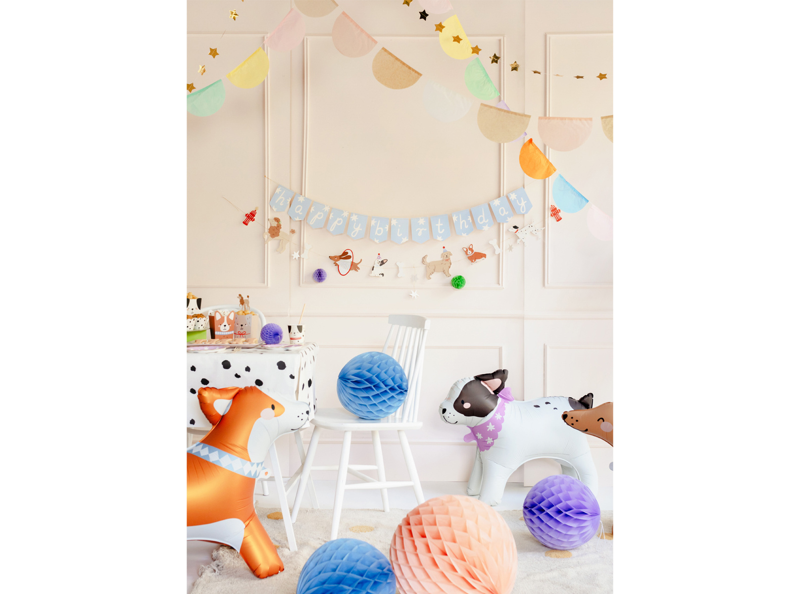 - Papír banner kutyákkal, csontokkal, tűzcsapokkal, csillagokkal és rózsás gömbökkel.