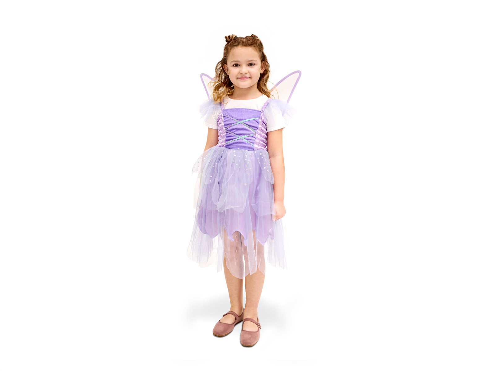 • Tartalmazza: lila ruha kék tüll betétekkel és a ruha hátuljára tépőzárral rögzített hálós szárnyakkal.
