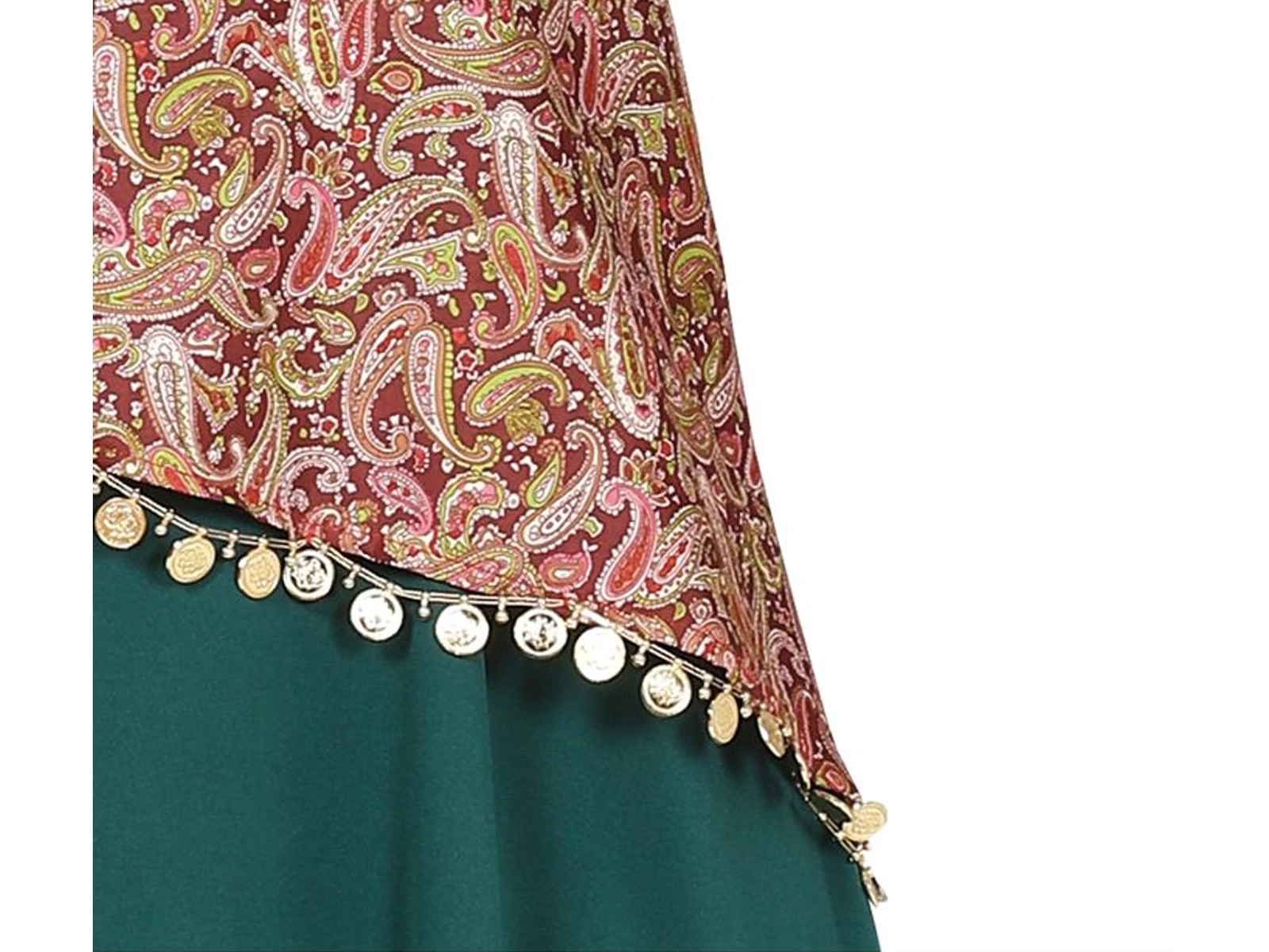 A készlet tartalmazza: egy szemet gyönyörködtető, hosszú ujjú, bordó-zöld színű ruha, amely gyönyörűen áramlik, és egy stílusos fejdísz teszi teljessé az öltözéket.