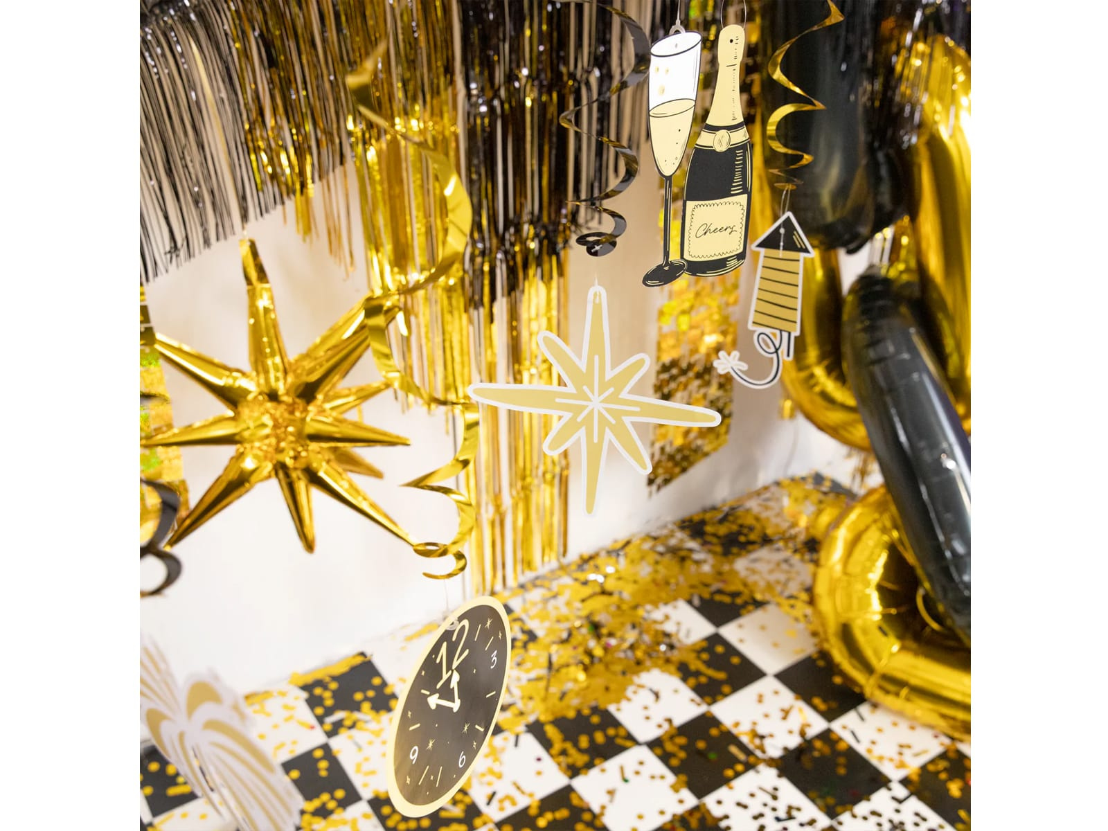 A készlet pezsgősüveg, tűzijáték, pohár és óra alakú medálokat tartalmaz.
