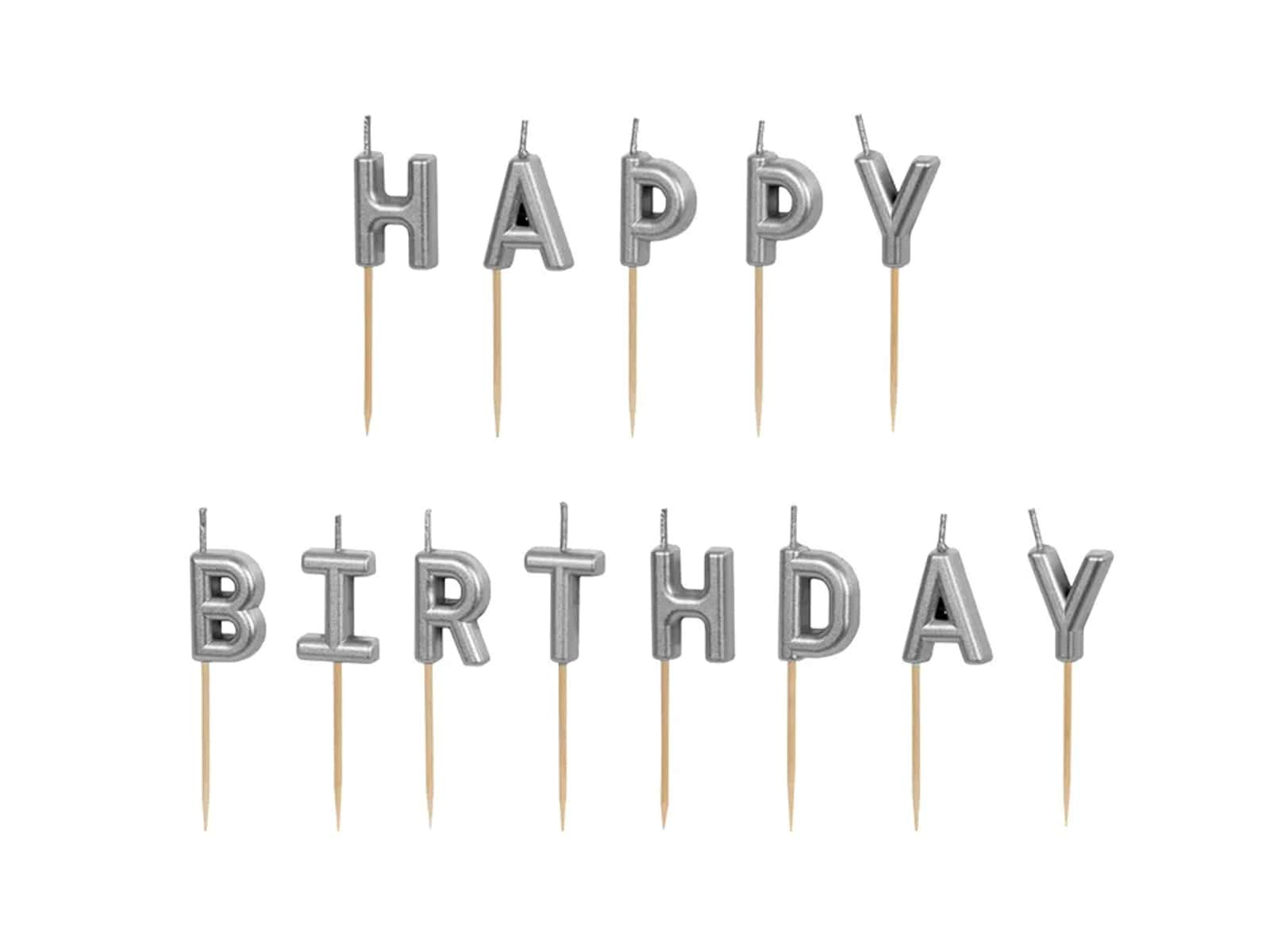 • Boldog születésnapot feliratot formázó betűgyertyák készlete ezüst színben.