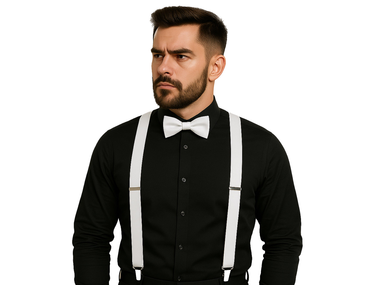 Fehér nadrágtartó kiegészítő szett nagy csokornyakkendővel - 2 db.